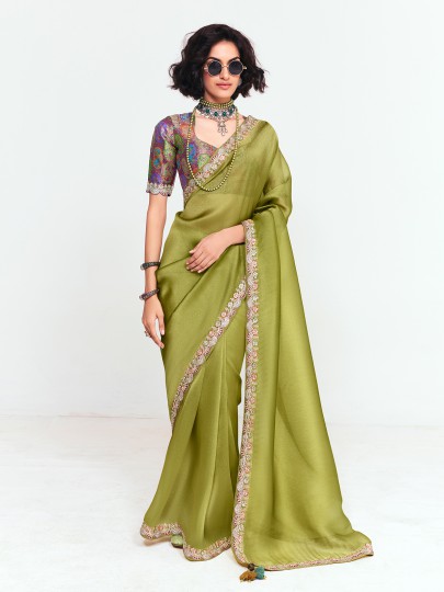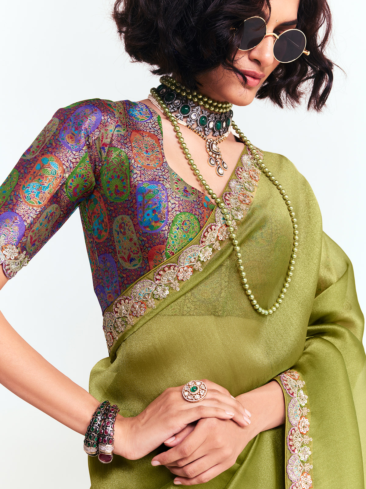 Radiate festive charm in this olivr green tissue saree crafted for elegant celebrations. The fluid drape is enhanced with a hand-embroidered scalloped border detailed with gold resham, sequins, and floral motifs, adding a luxurious glow. Paired with an unstitched blouse embellished with intricate multicolored threadwork and peacock motifs, the ensemble offers a vibrant ethnic look.