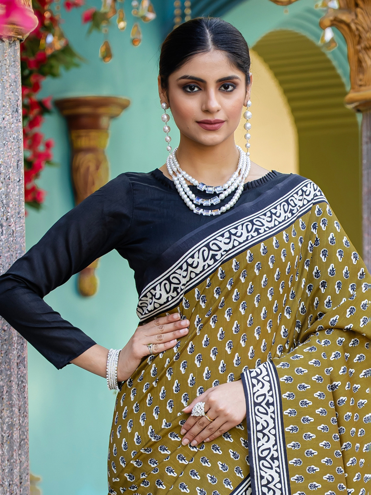 This olive-colored Bhagalpuri silk saree is a reflection of refined taste. Featuring a beautiful print and luxurious fabric, it offers a perfect blend of style and comfort. Comes with an unstitched blouse piece for customization.