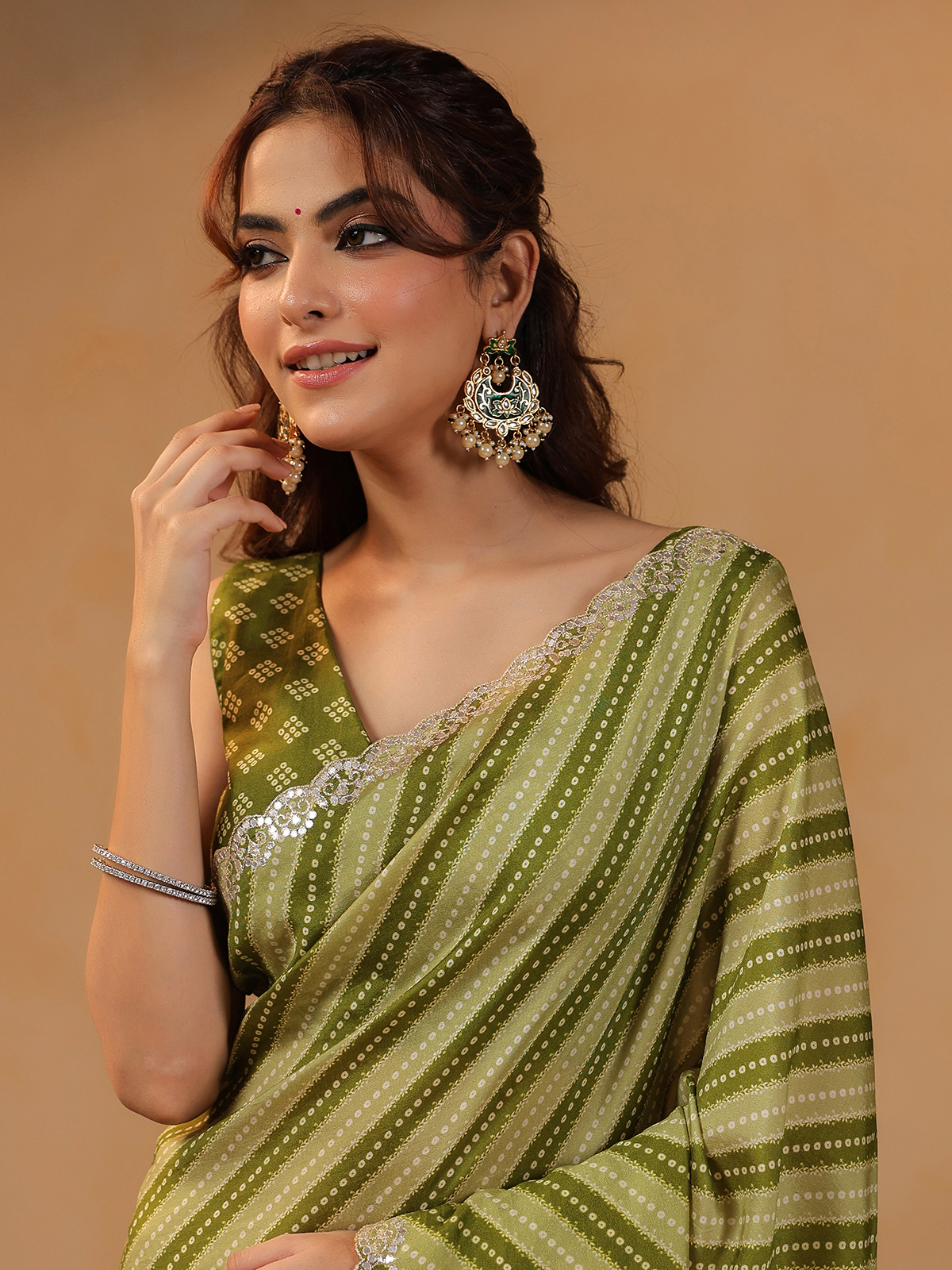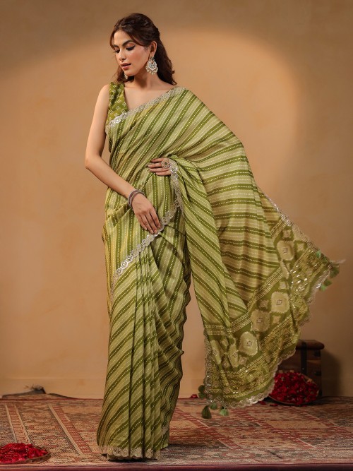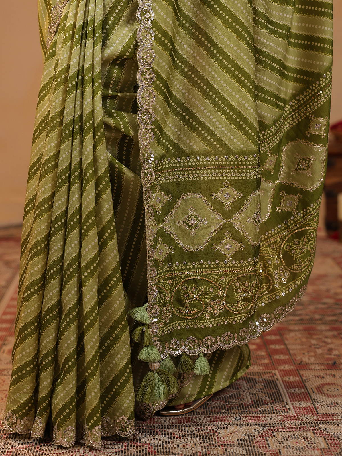 Earthy sophistication flows through the olive silk printed saree, soft on the body. Aabla, resham, gota, sequins, and beads craft sparkling motifs. Includes an unstitched blouse piece for festive celebrations.