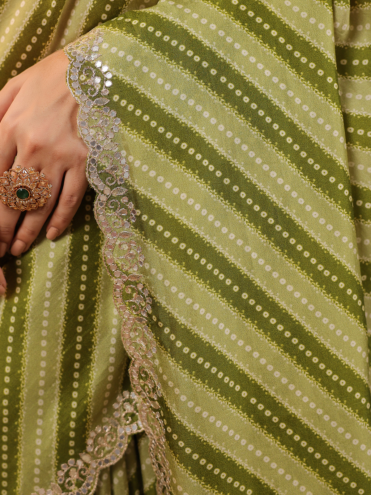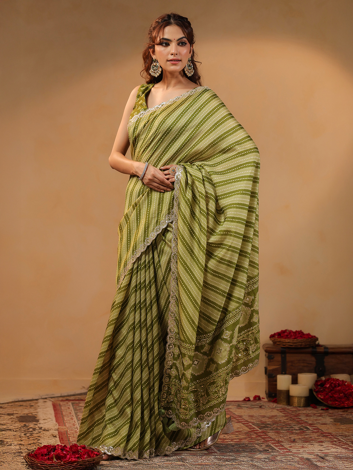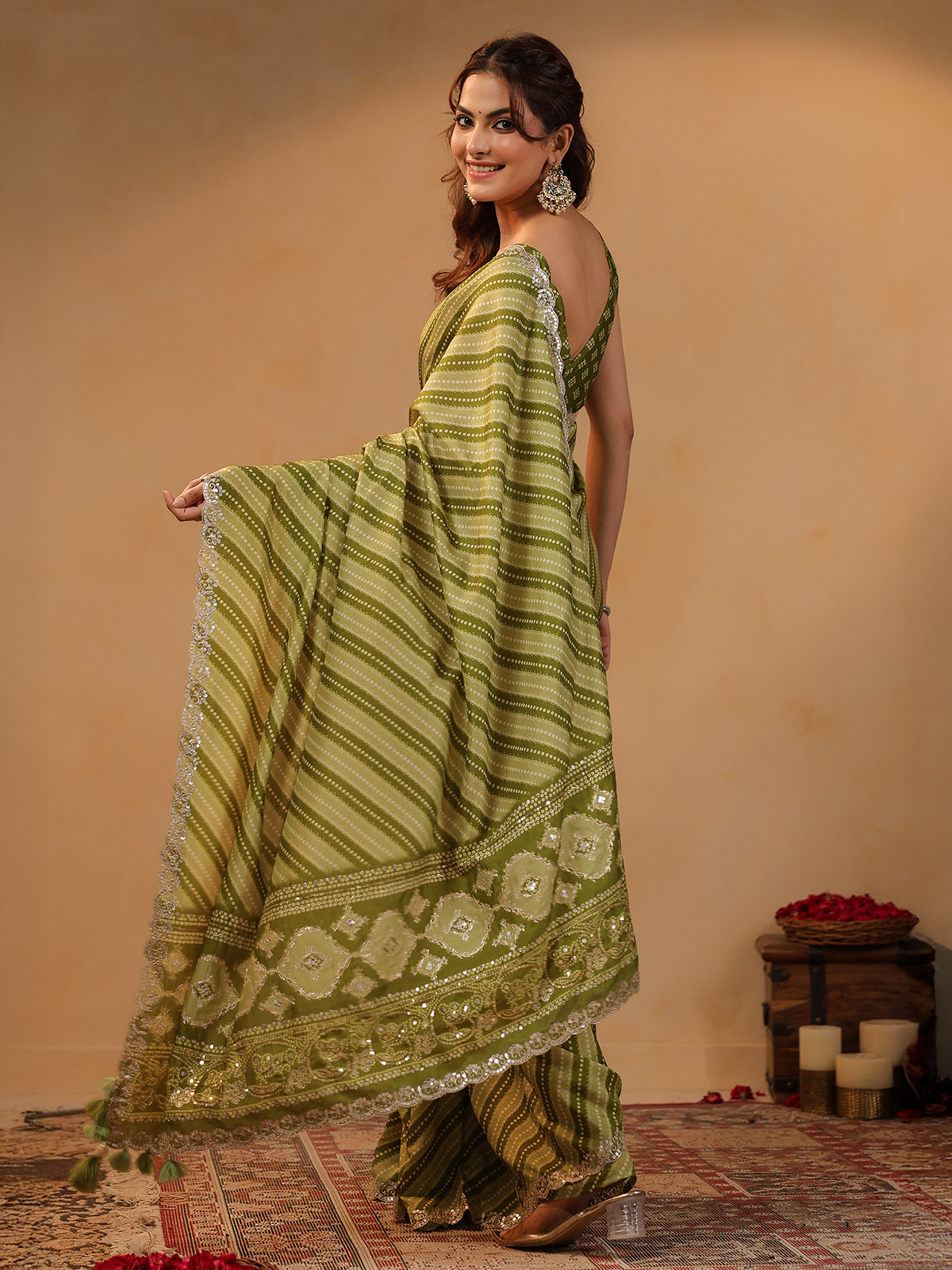 Earthy sophistication flows through the olive silk printed saree, soft on the body. Aabla, resham, gota, sequins, and beads craft sparkling motifs. Includes an unstitched blouse piece for festive celebrations.