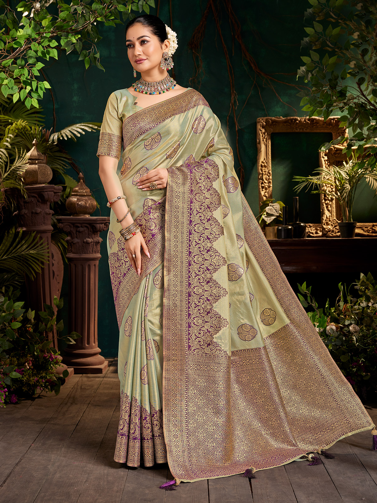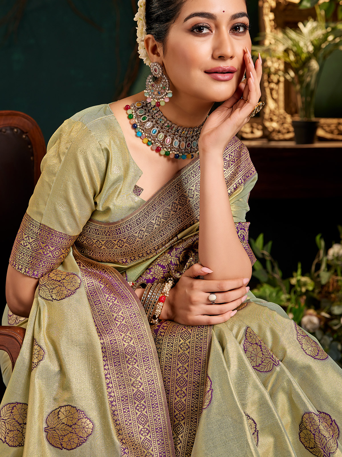 Crafted in serene olive dyed silk, this saree highlights intricate zari floral motifs and traditional patterns. The wide border and beautifully embellished pallu enhance its opulent appeal. With an unstitched blouse included, it is perfect for weddings, mehndi ceremonies and festive occasions where refined elegance is desired.