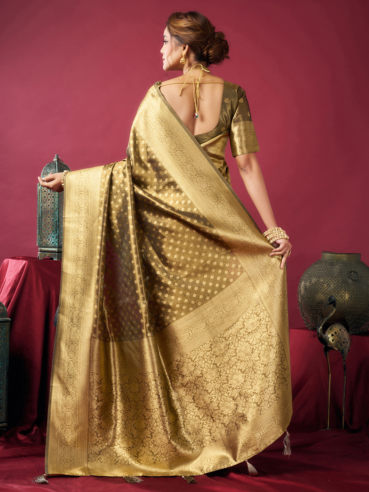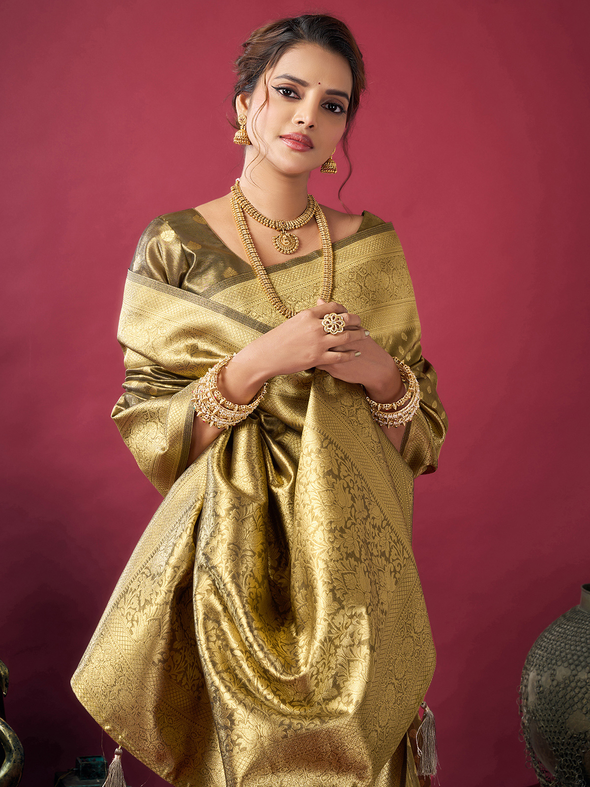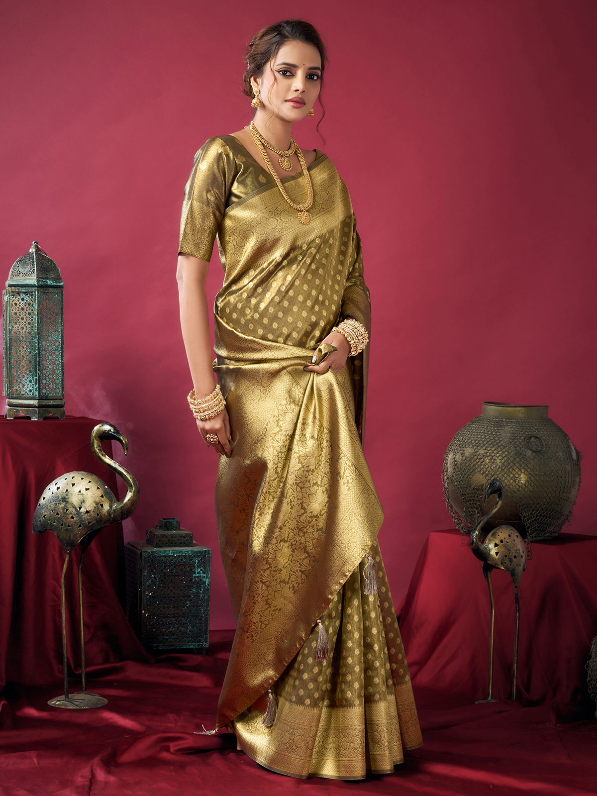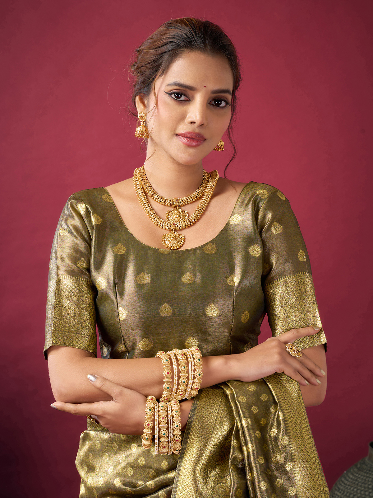 In rich olive tissue silk, this saree breathes understated elegance. Zari detailing flows through the fabric like sunbeams filtering through ancient trees. Designed for meaningful celebrations, it arrives with an unstitched blouse piece—ready to reflect your poised and serene beauty.