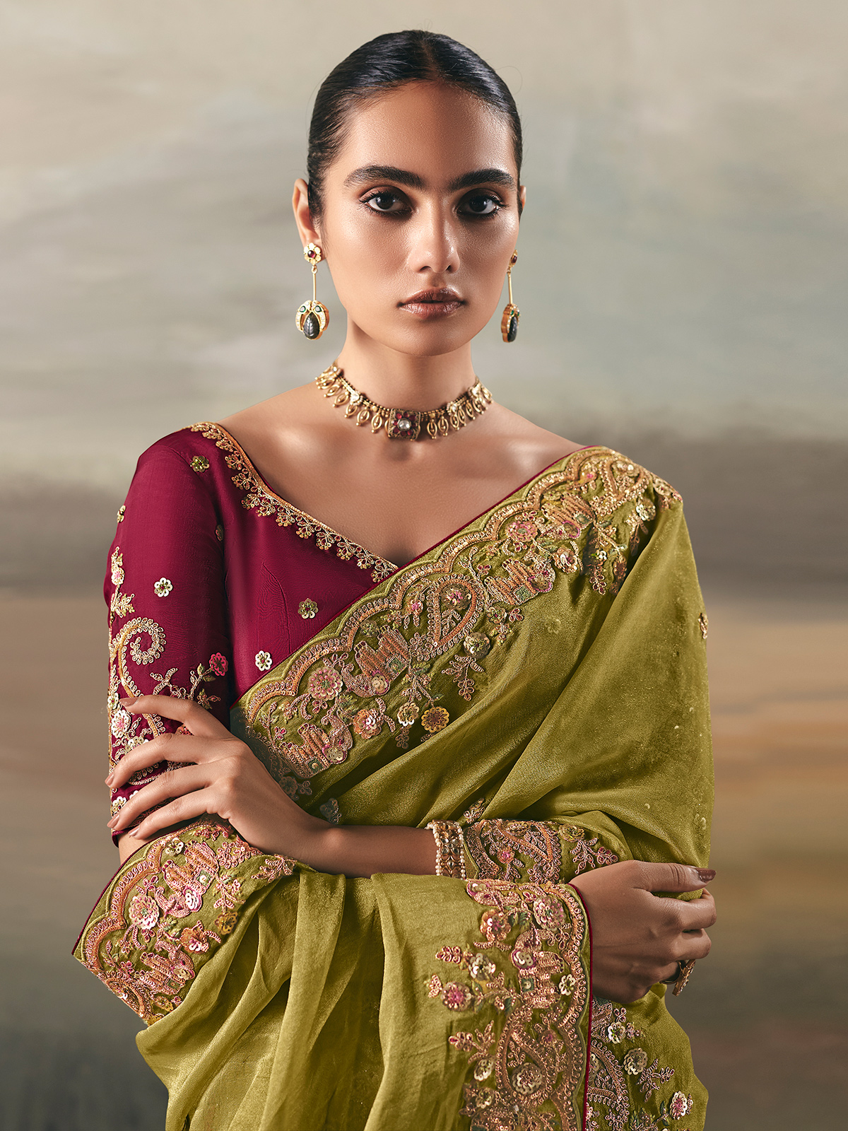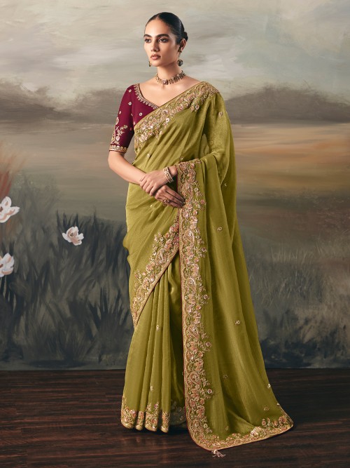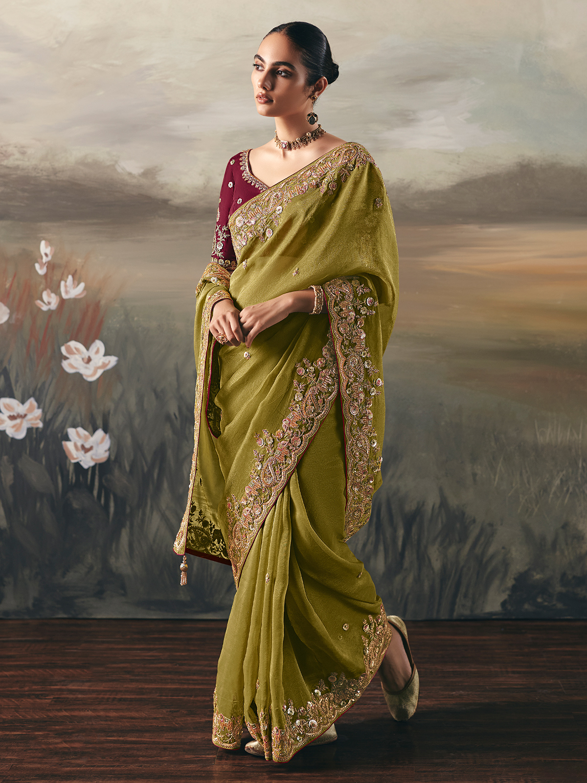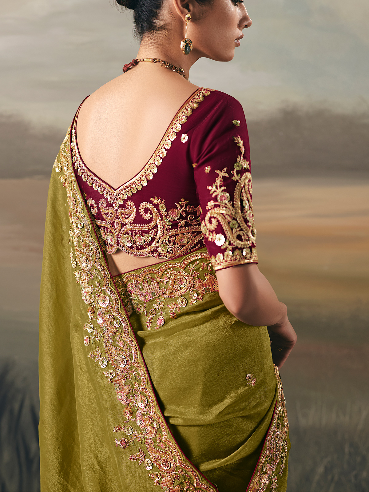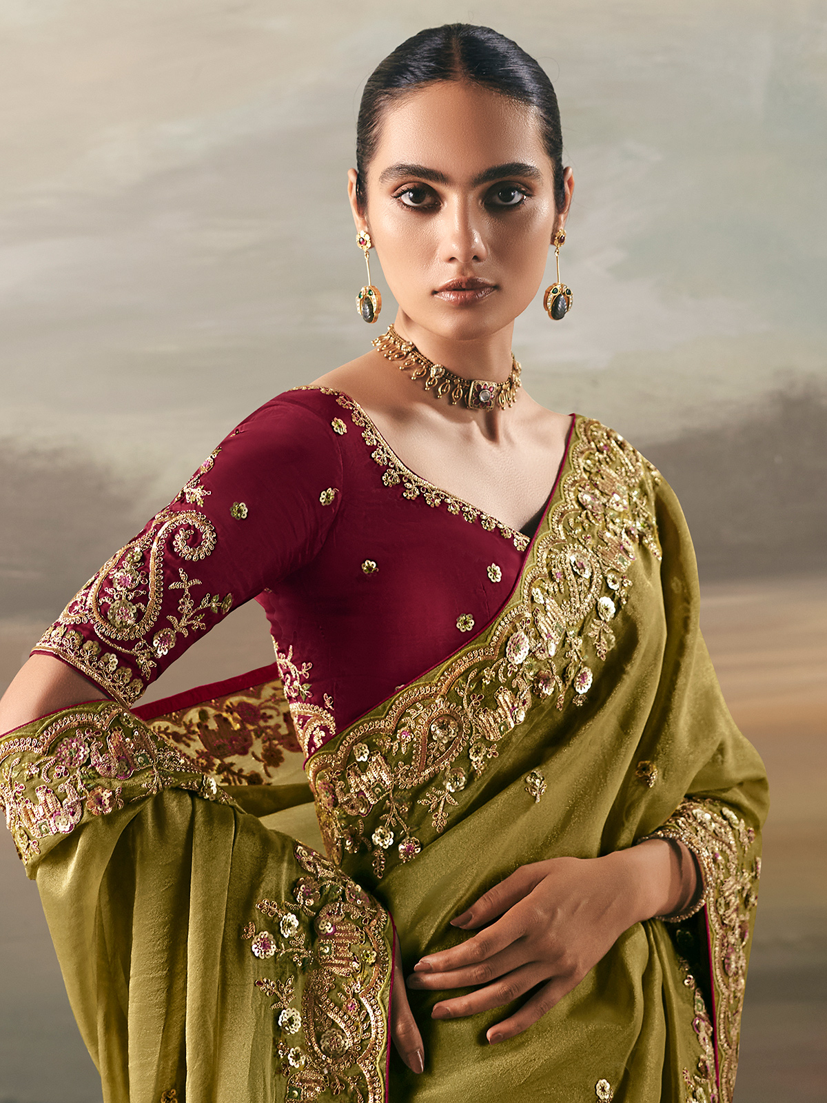 This olive tissue silk saree features intricate sequins, stones, zardosi, resham, embroidery, and bead accents. A heavily embellished border adds a luxurious touch. Perfect for weddings, receptions, mehendi, and sangeet, it comes with an unstitched blouse for a customizable fit.