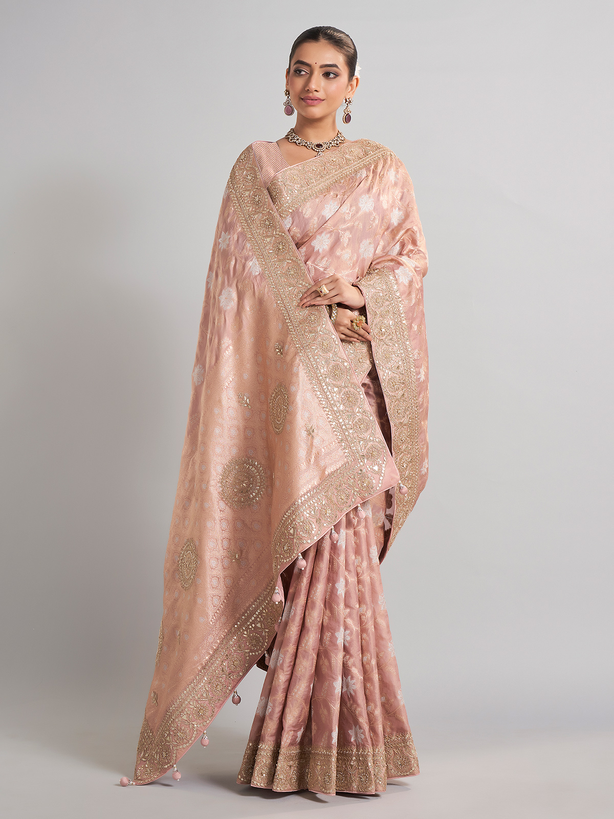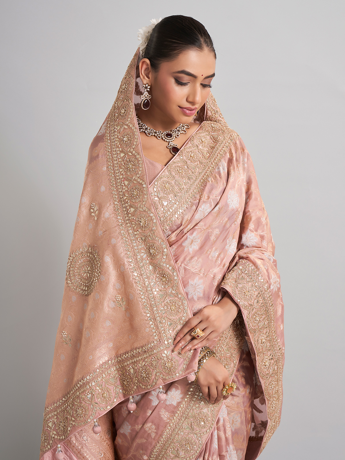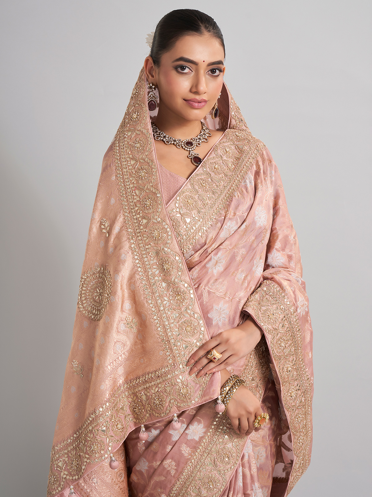 A blend of softness and grandeur, this onion pink banarasi silk saree features sequins, zardosi, gota, and thread work. Ideal for wedding sangeets and evening events, includes an unstitched blouse piece.