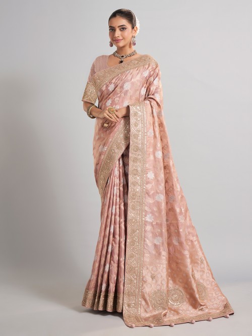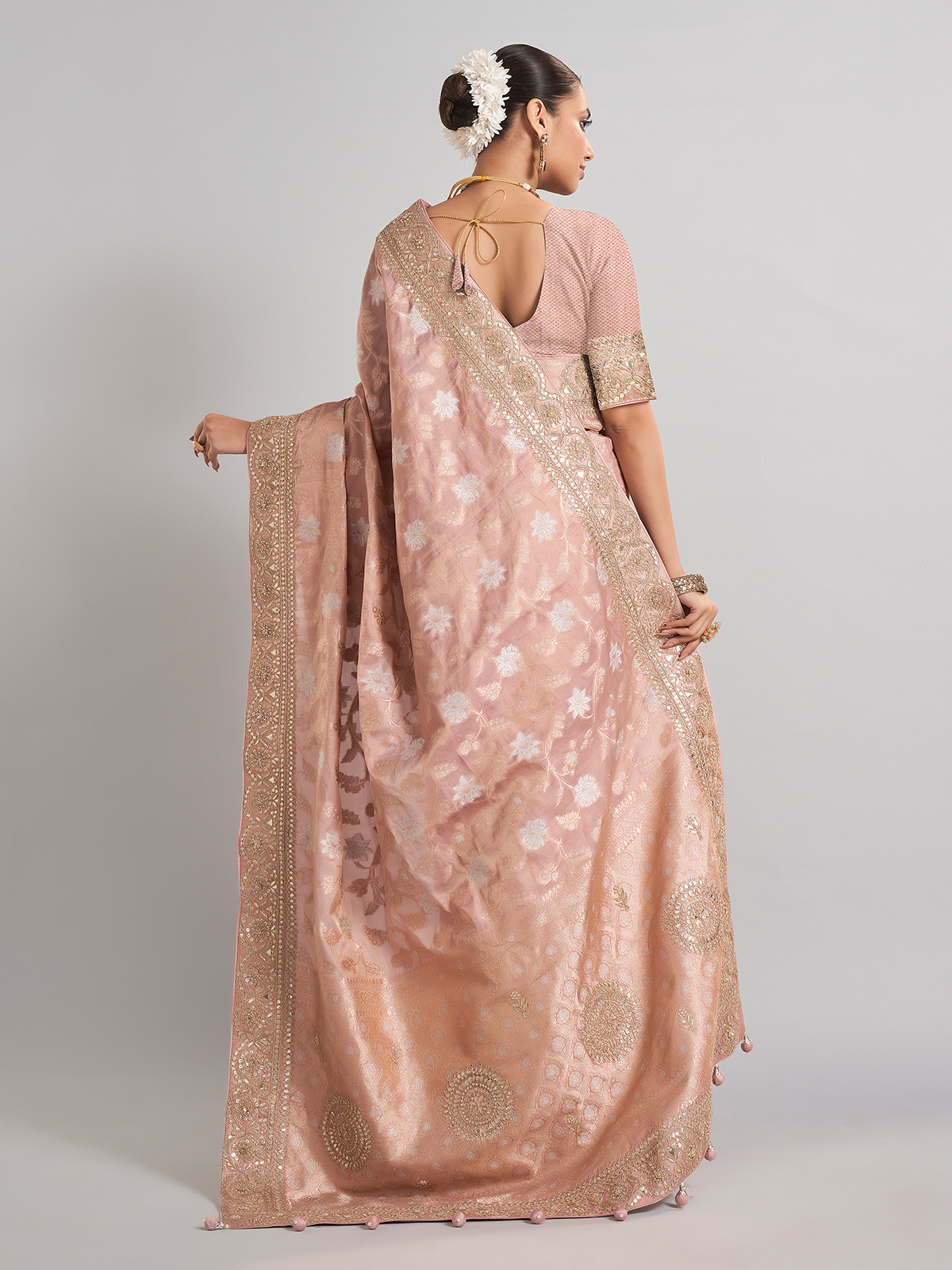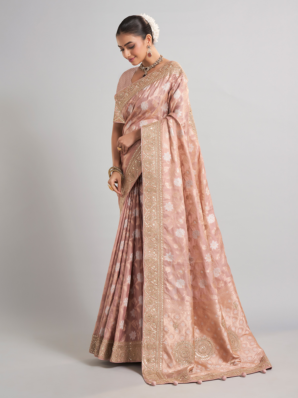 A blend of softness and grandeur, this onion pink banarasi silk saree features sequins, zardosi, gota, and thread work. Ideal for wedding sangeets and evening events, includes an unstitched blouse piece.