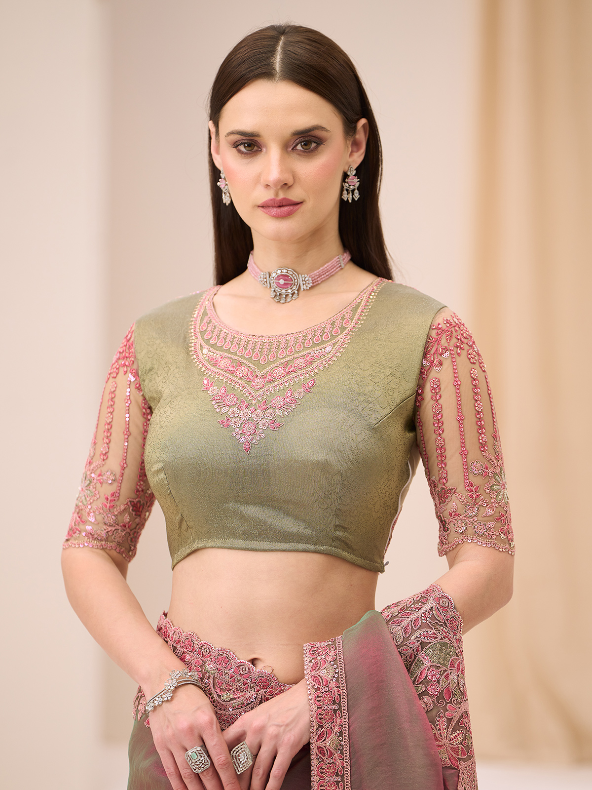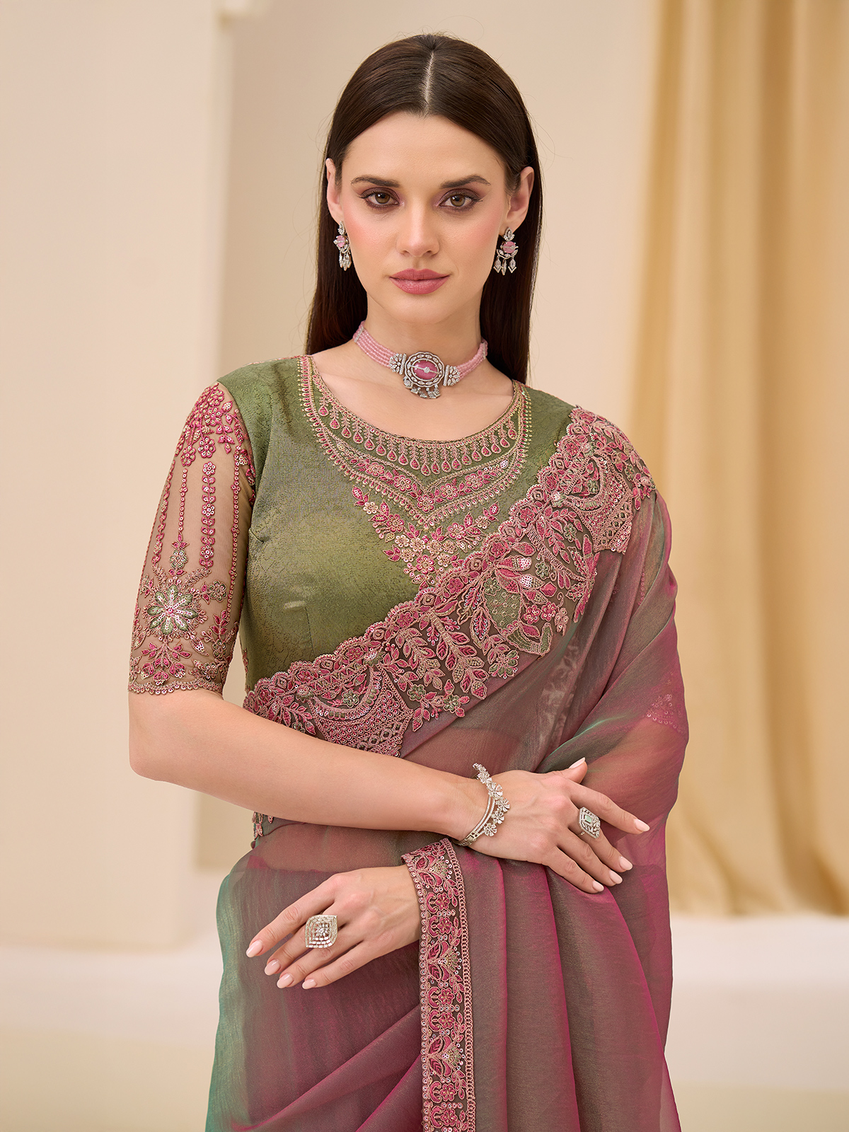 Radiate feminine charm in this dual shade onion pink georgette saree that drapes with fluid elegance and soft movement. Enhanced with delicate resham and sequins work on the border, it brings graceful shimmer and texture to the ensemble. A perfect pick for festive gatherings and parties, complemented with an unstitched blouse for versatile styling.