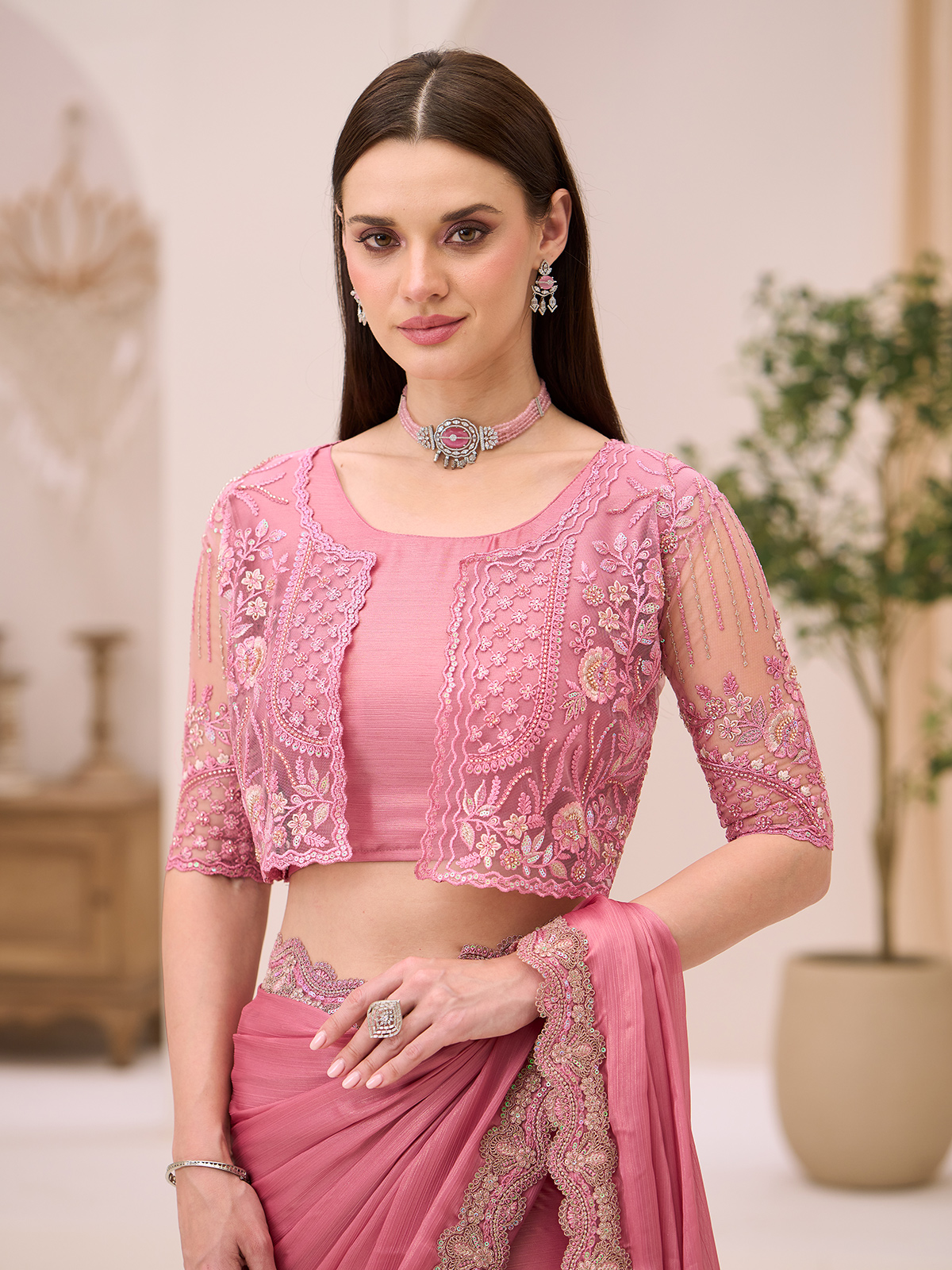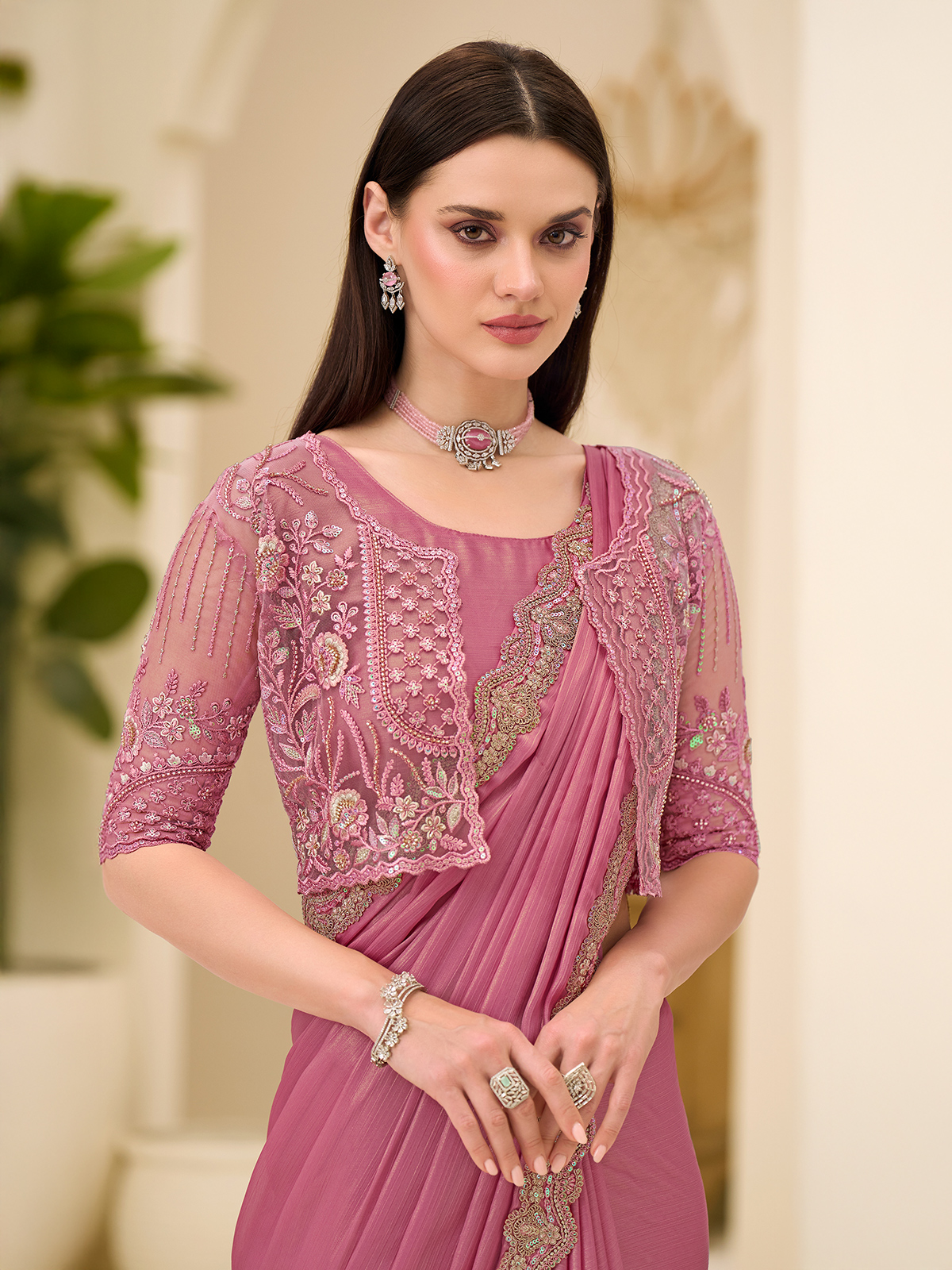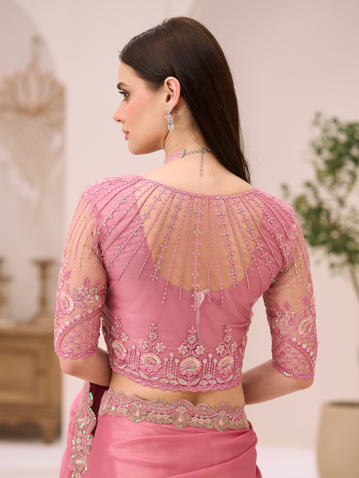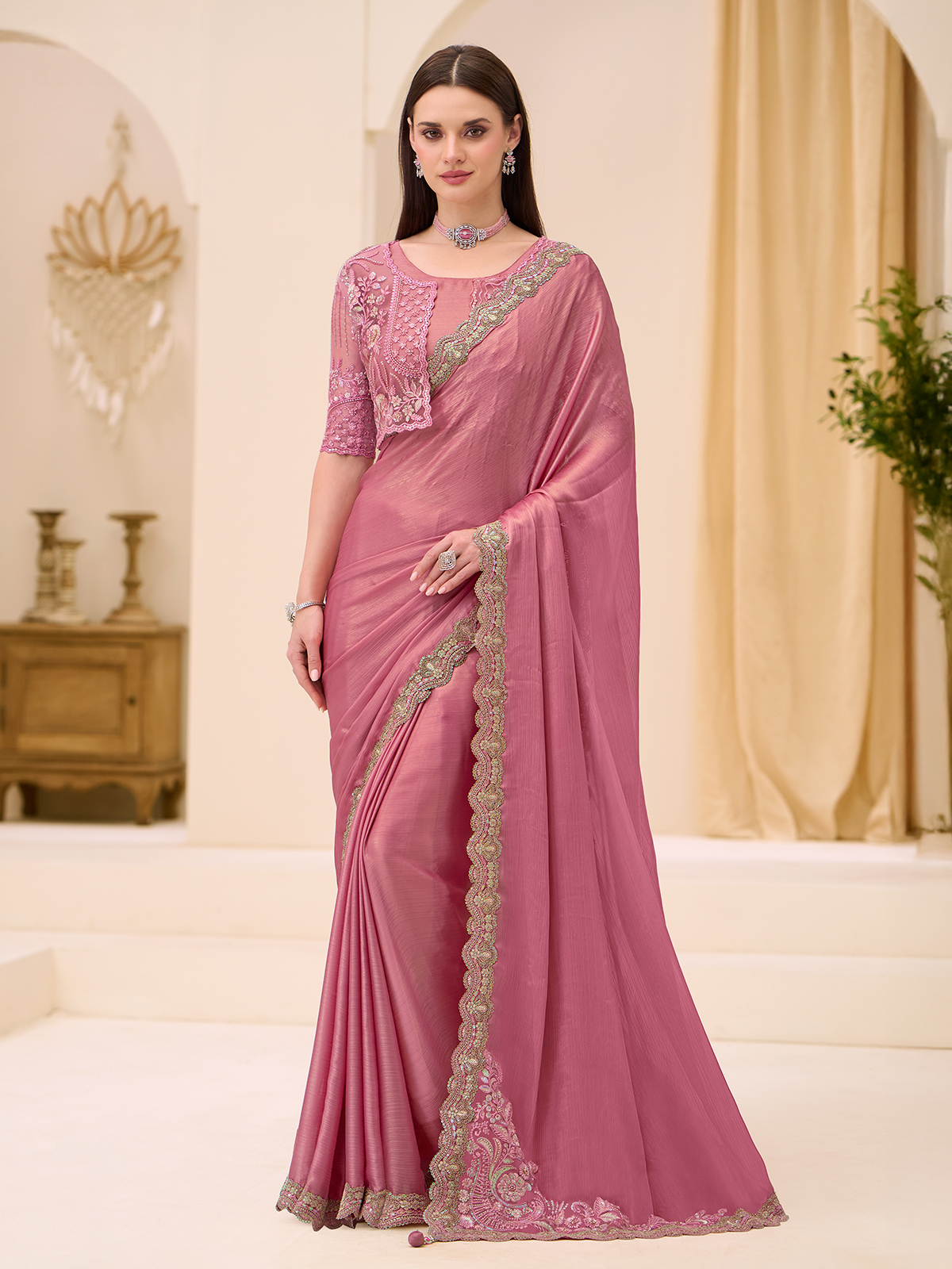 Delicate charm defines this onion pink satin saree that enhances your feminine grace effortlessly with its soft shine and elegant fall. Designed with resham, cutdana and sequins work on the border, it adds intricate brilliance and sparkle. Suitable for festive occasions and parties, it includes an unstitched blouse for a tailored finish.