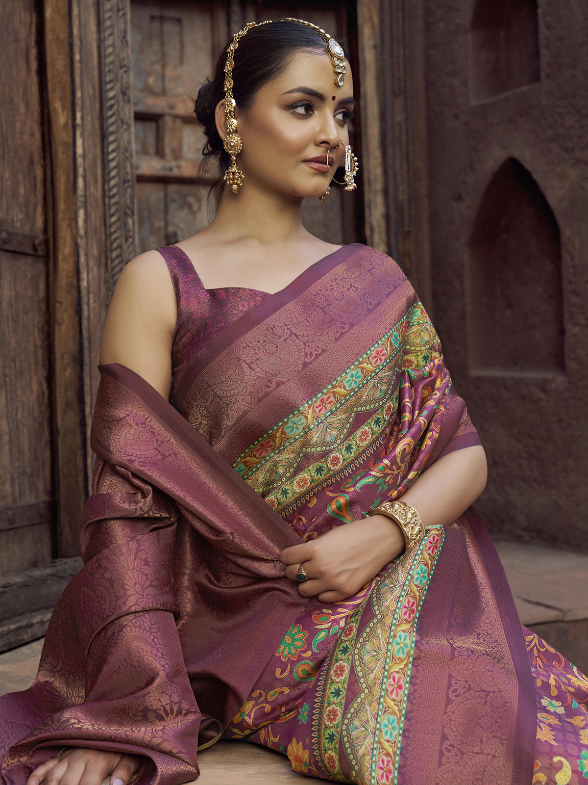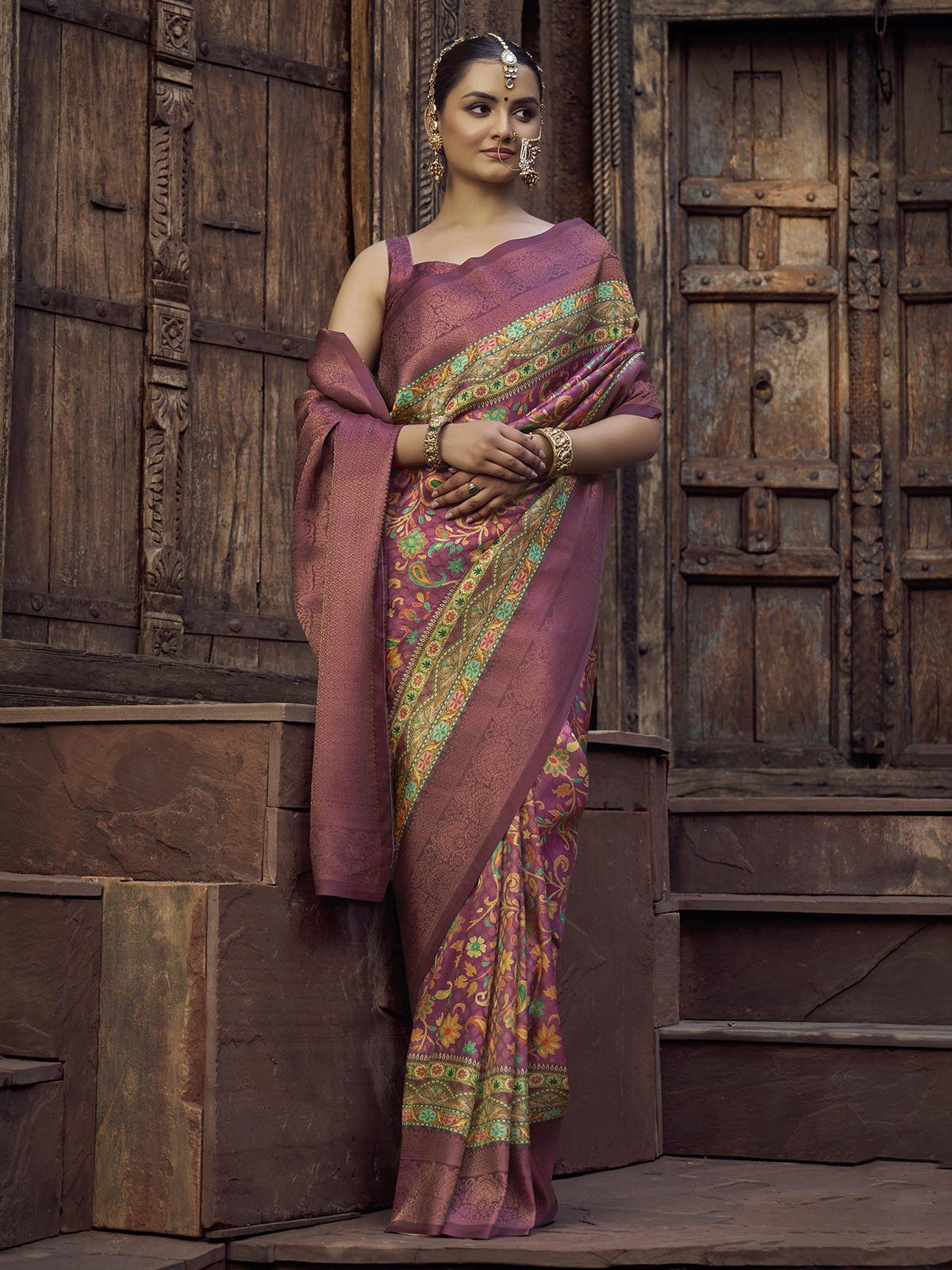 Wrapped in soft onion pink silk, this saree features luminous zari work that enhances its delicate charm. Designed with an unstitched blouse, it suits weddings, festive evenings and reception looks. The gentle color paired with elegant craftsmanship creates an effortlessly refined traditional appeal.