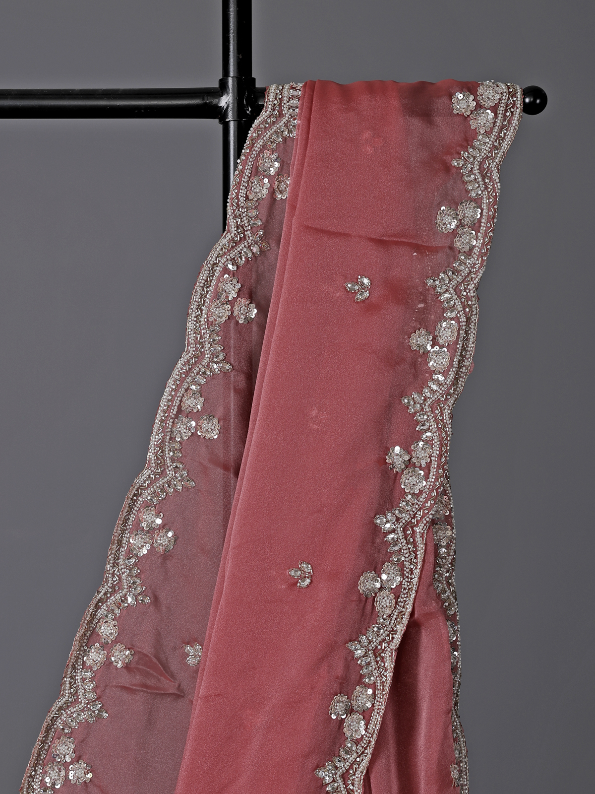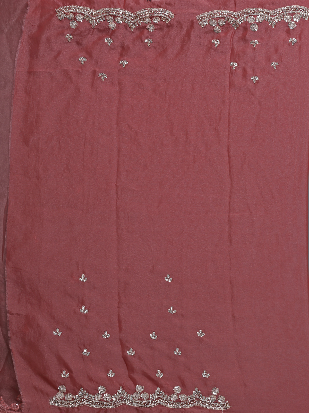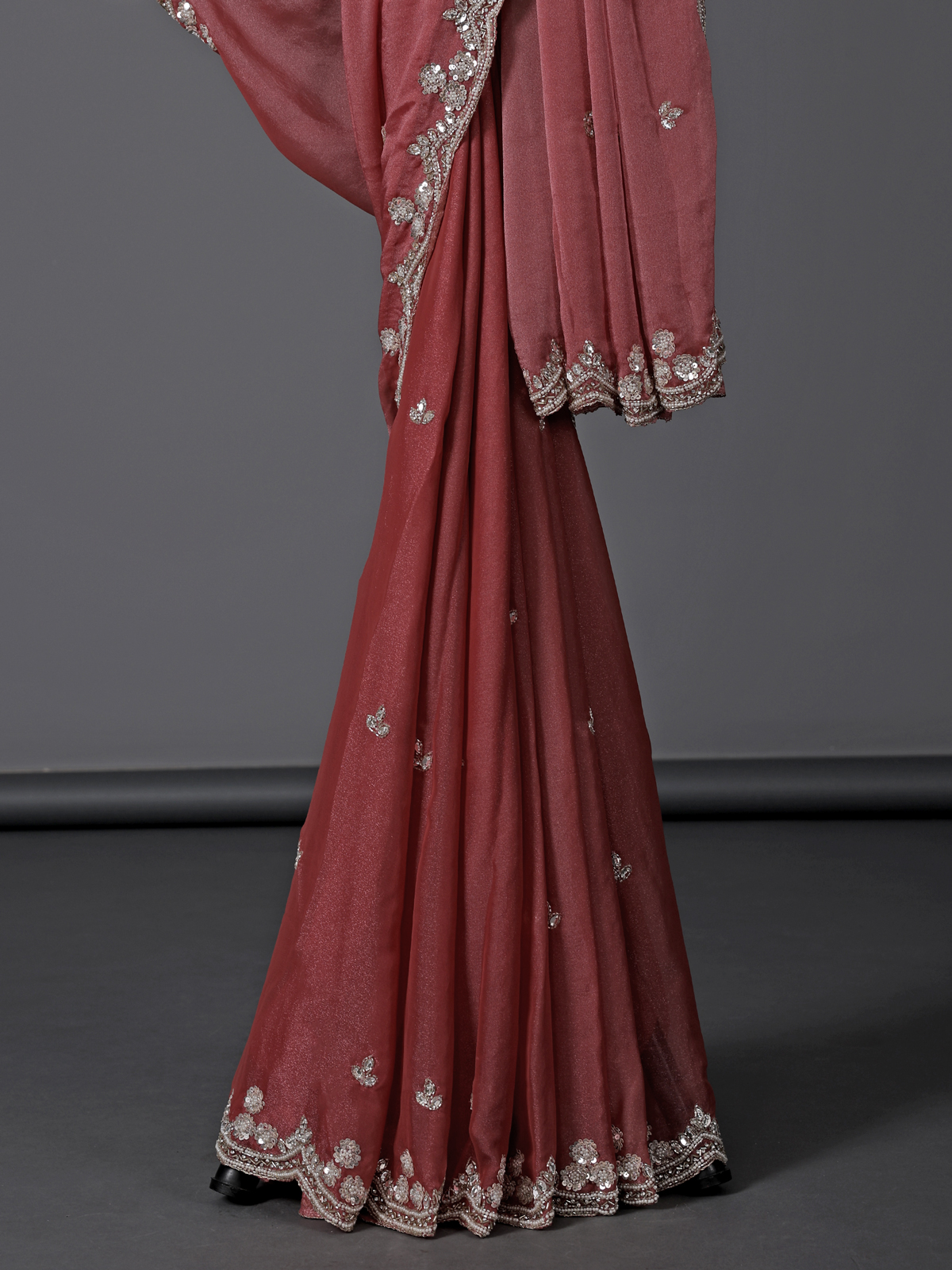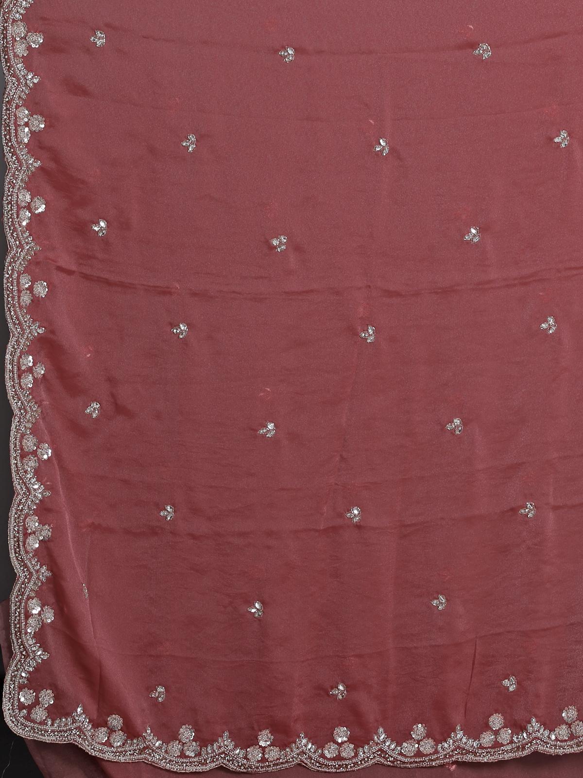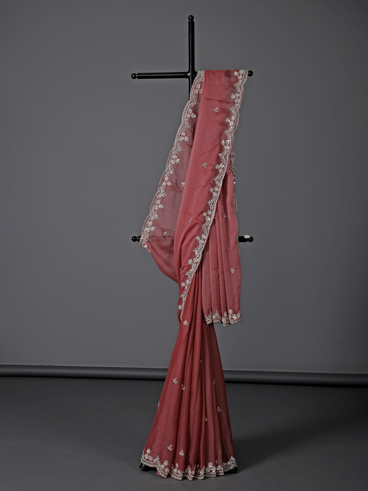 Graceful onion pink tones highlight the charm of this tissue silk saree designed for refined celebrations. Detailed with cutdana, sequins, beads and diamond work. It reflects subtle luxury. The flowing drape enhances feminine elegance. Making it perfect for weddings, receptions and parties. Paired with an unstitched blouse piece for a complete look.