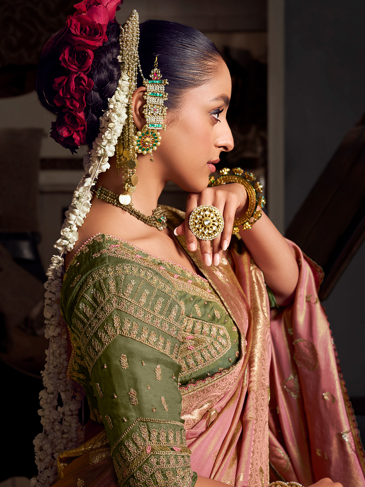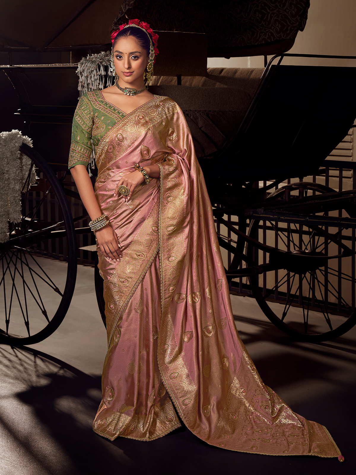 This onion pink viscose tissue silk saree shimmers with cutdana, beads, resham, and zari embroidery, radiating lively festive charm. Ideal for weddings and celebrations, it comes with an unstitched blouse piece, allowing you to tailor an elegant, personalized ensemble.