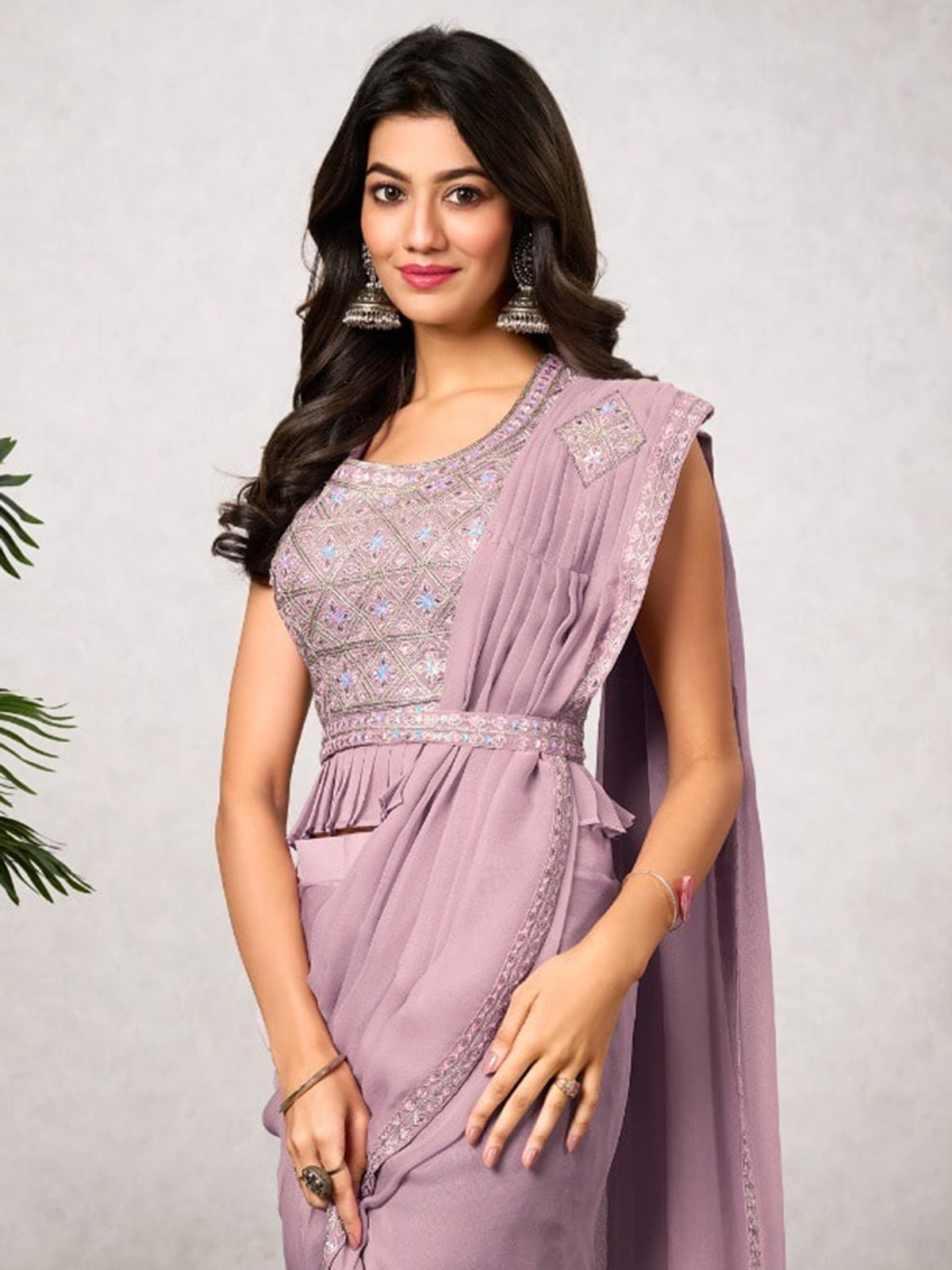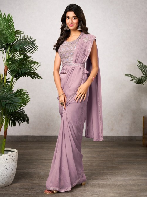 Experience chic comfort with our onion pink shimmer georgette ready-to-wear saree, detailed with embroidery and sequins for a graceful look. Comes with a ready to wear blouse.