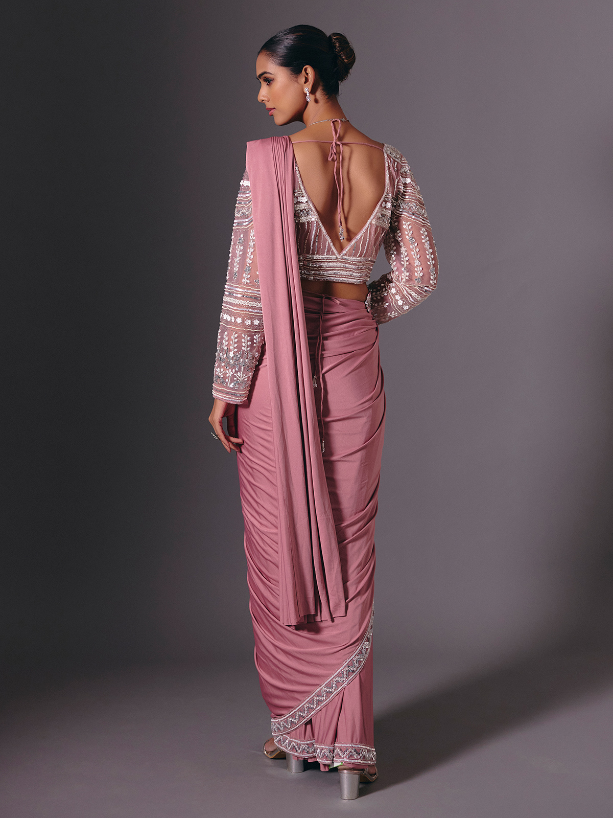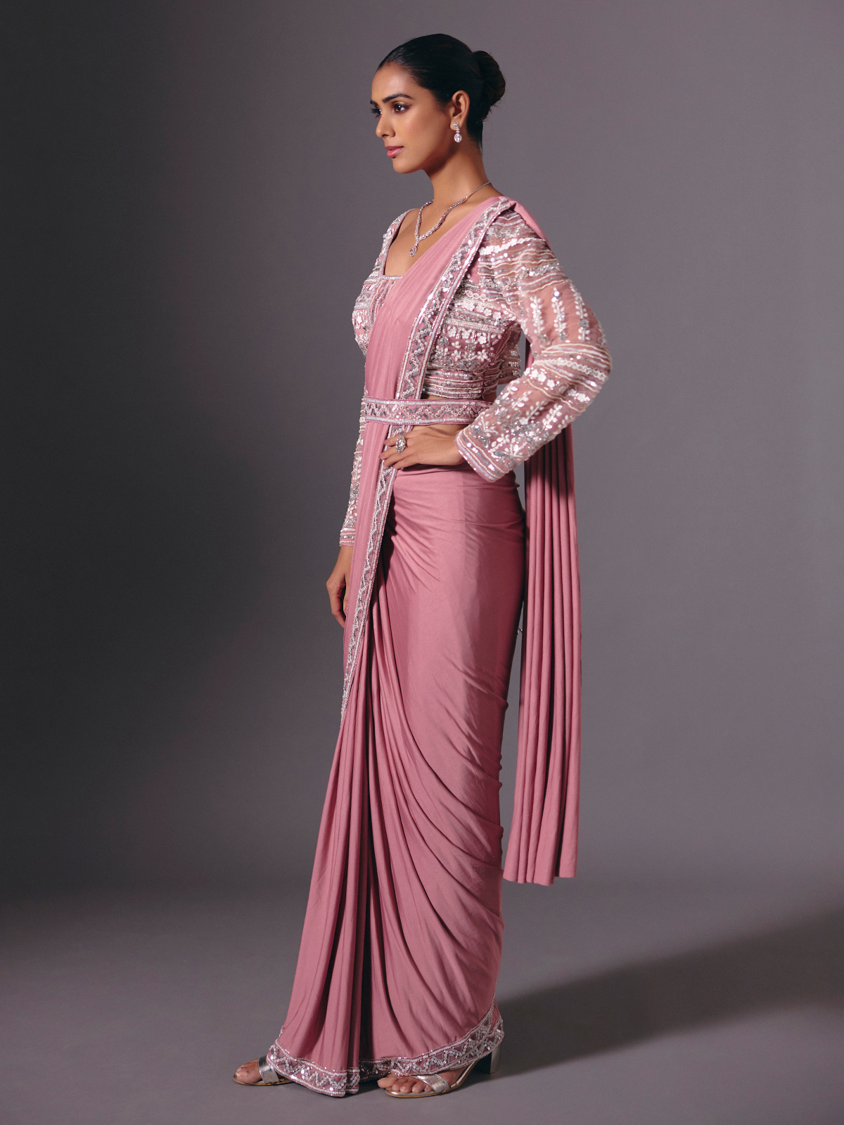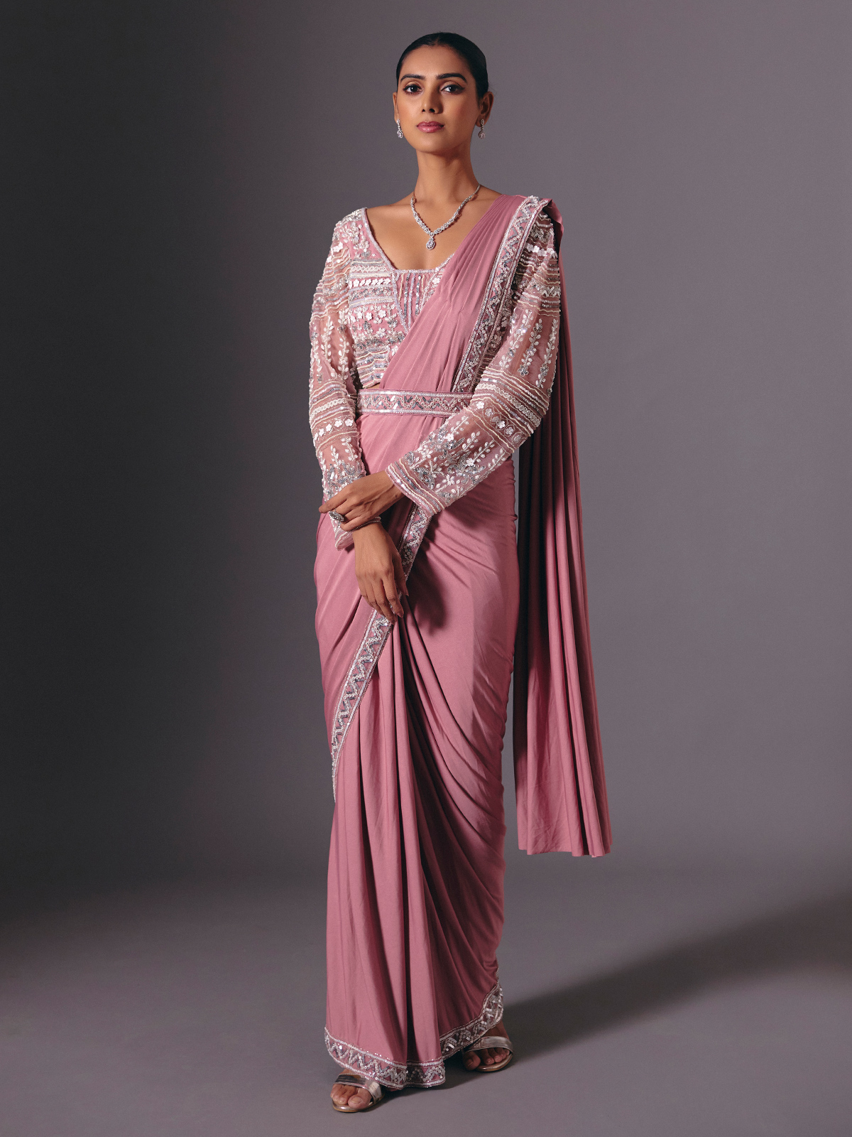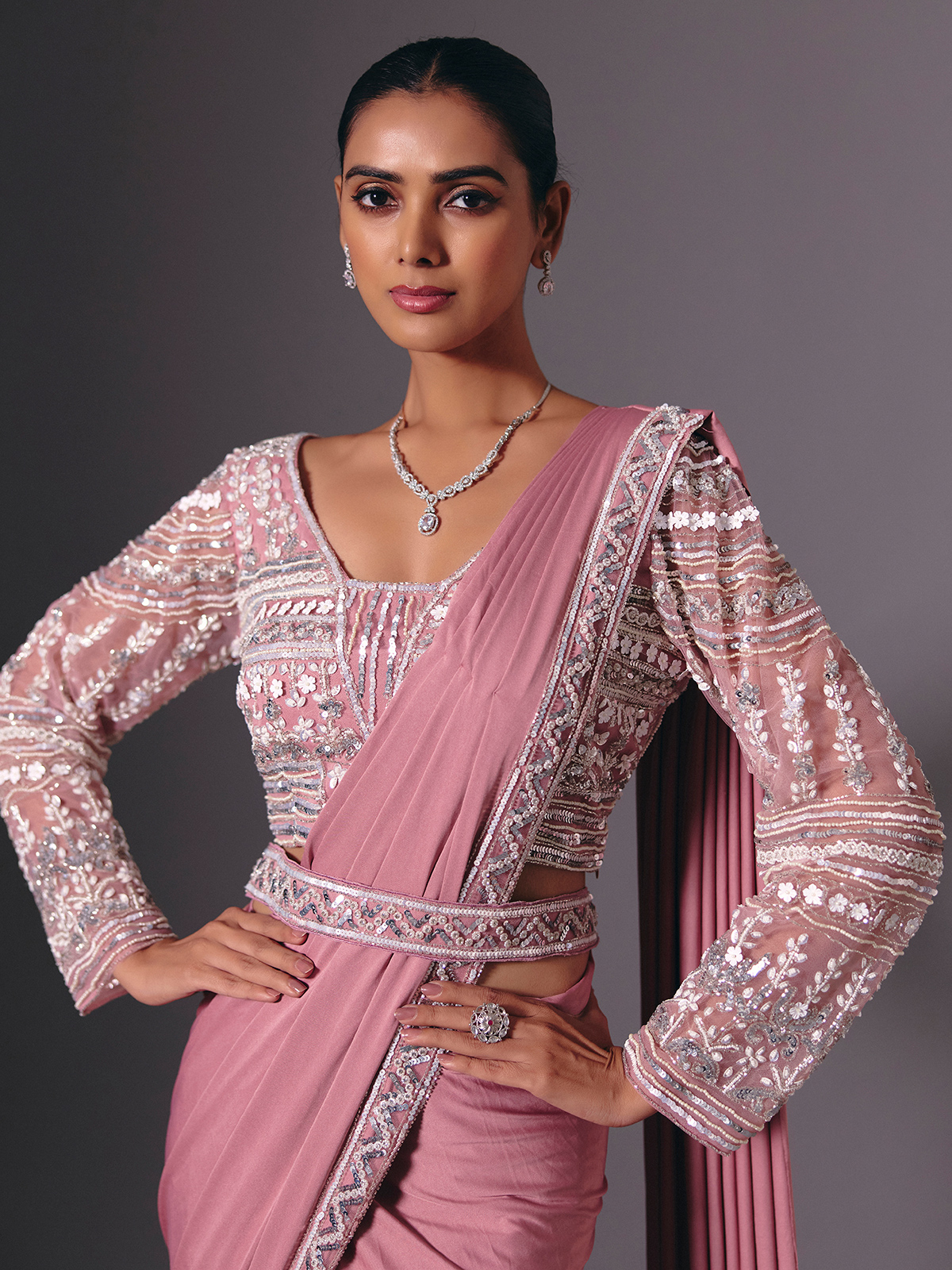 Dazzling with cutdana, sequins, beads, diamonds, and pearls, this onion pink lycra saree is crafted for luxe celebrations. Paired with a chic designer waist belt, it offers a polished, contemporary shape perfect for receptions, weddings, and glamorous parties.