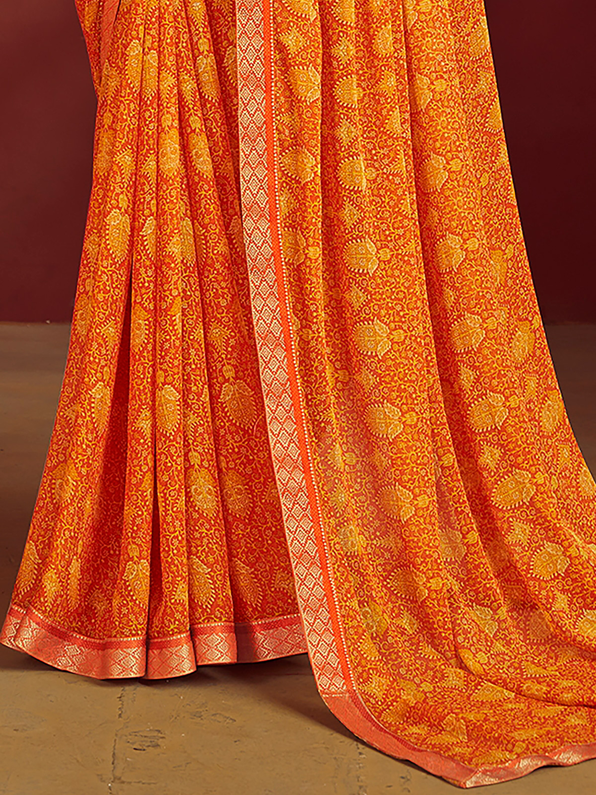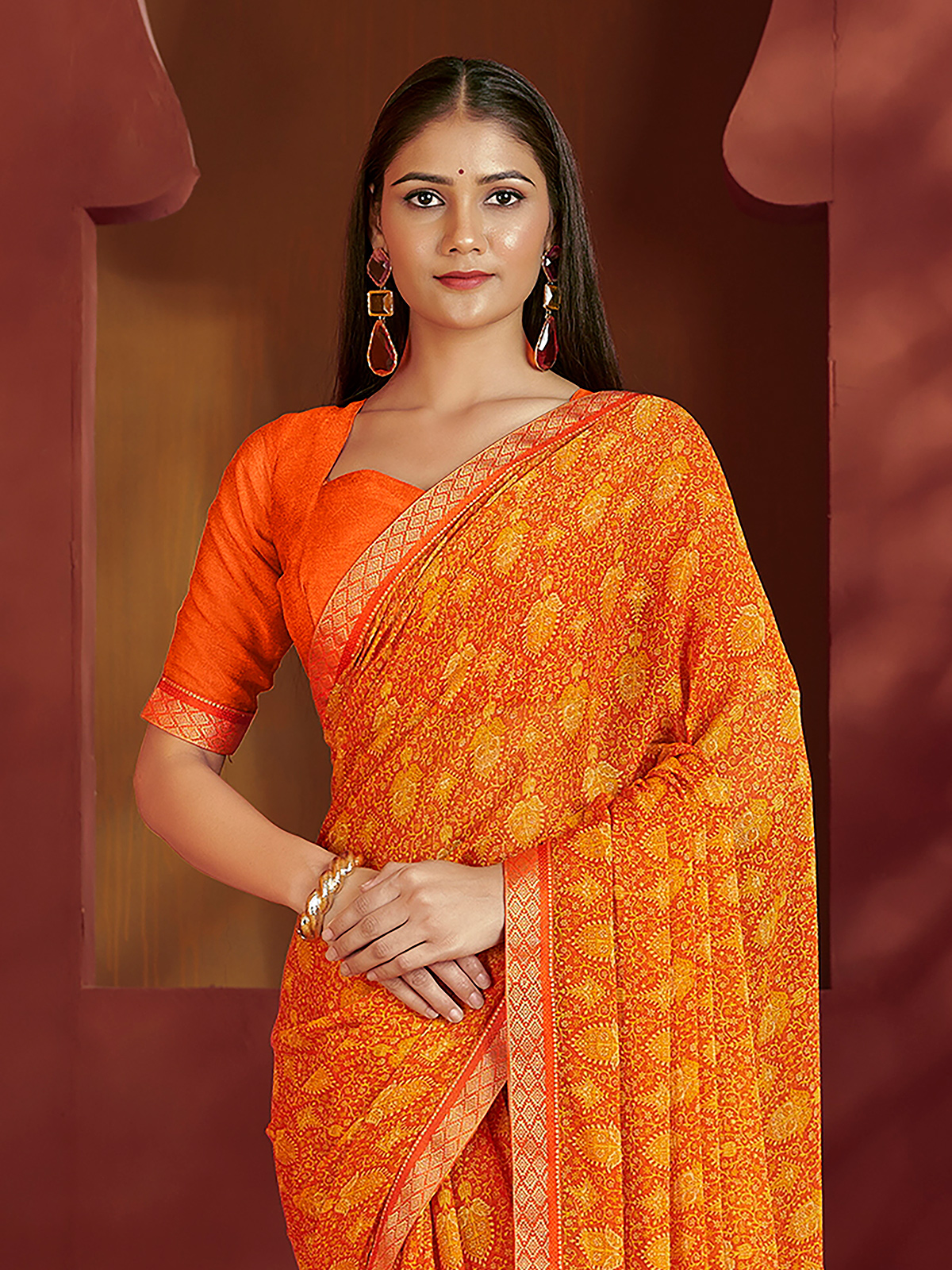 This vibrant orange chiffon saree features elegant printed patterns enhanced with delicate lace detailing and refined zari work along the border. Lightweight and flowy, it drapes beautifully for all-day comfort. Paired with an unstitched matching blouse piece, it is a versatile choice for festive celebrations, puja rituals and graceful casual occasions.