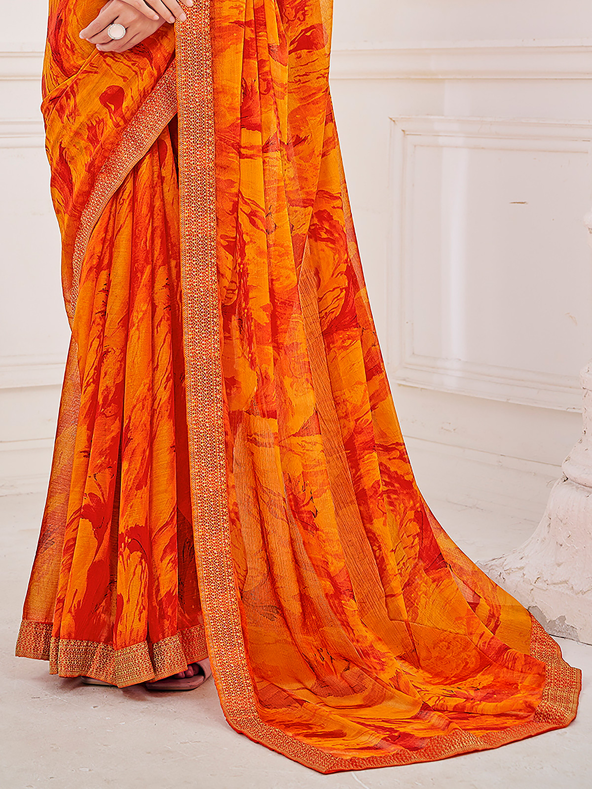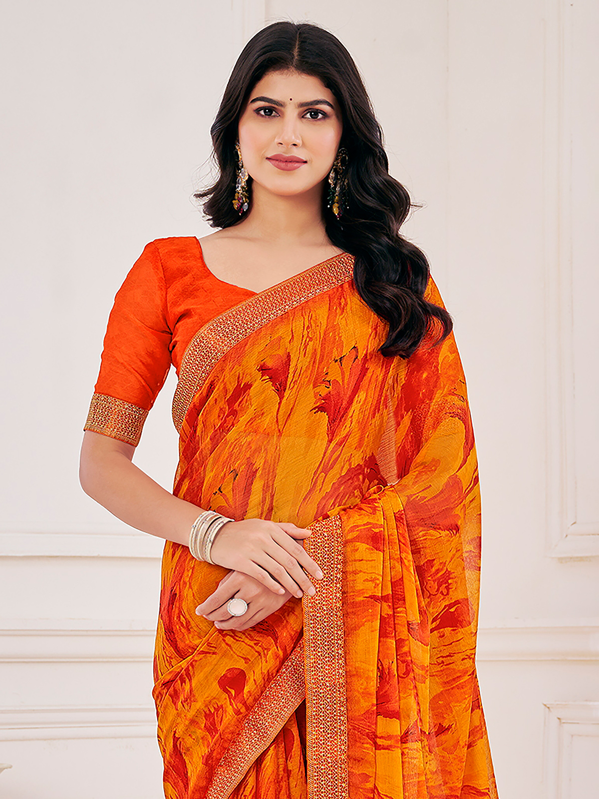 Vibrant orange georgette saree enhanced with delicate zari work and lively prints. Its airy fabric ensures comfort while adding festive charm. Paired with an unstitched blouse, this saree is ideal for haldi ceremonies and joyful festive occasions.