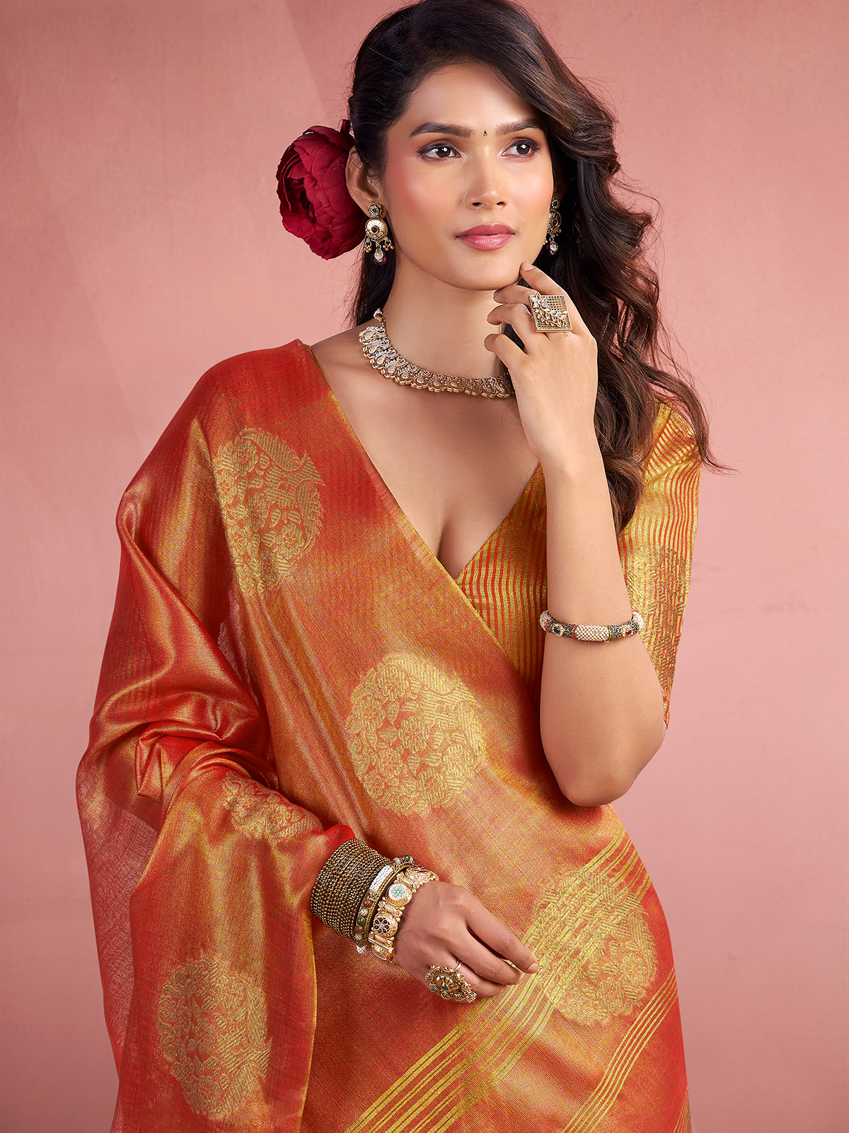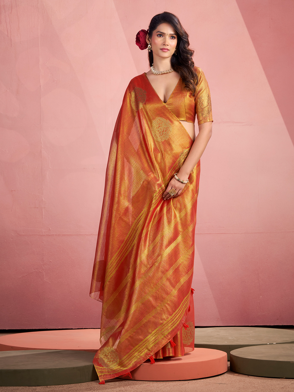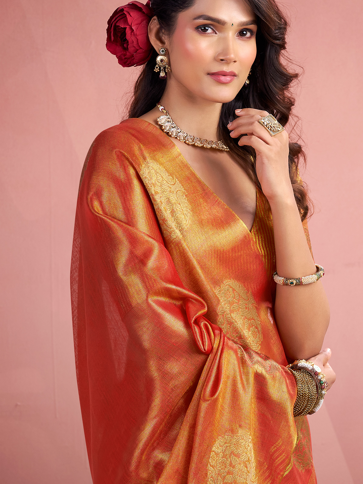 Make a statement at every celebration with this vibrant orange tissue silk saree, detailed with fine zari embroidery. Lightweight yet striking, it's designed to bring effortless glamour to your evening look. Comes with an unstitched blouse for tailored perfection.
