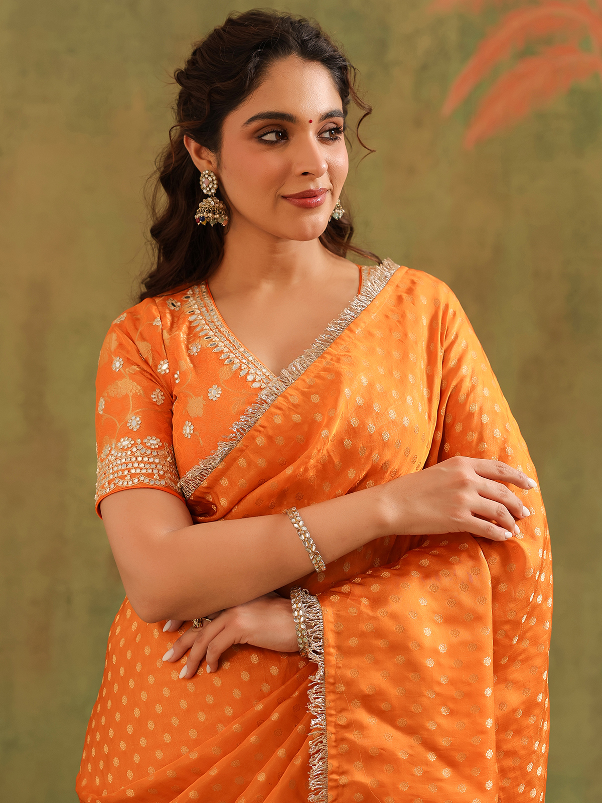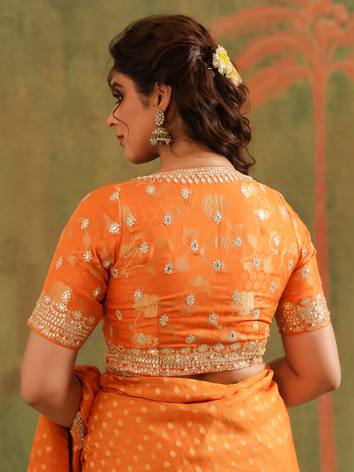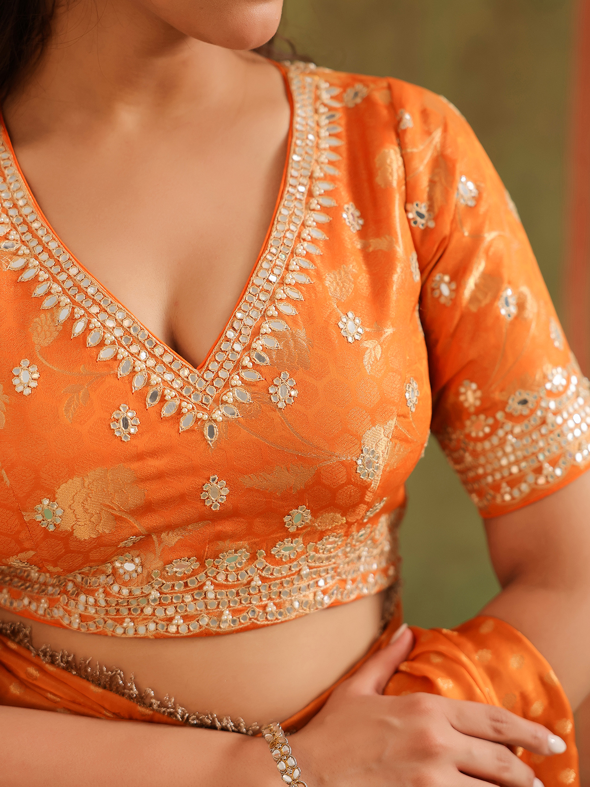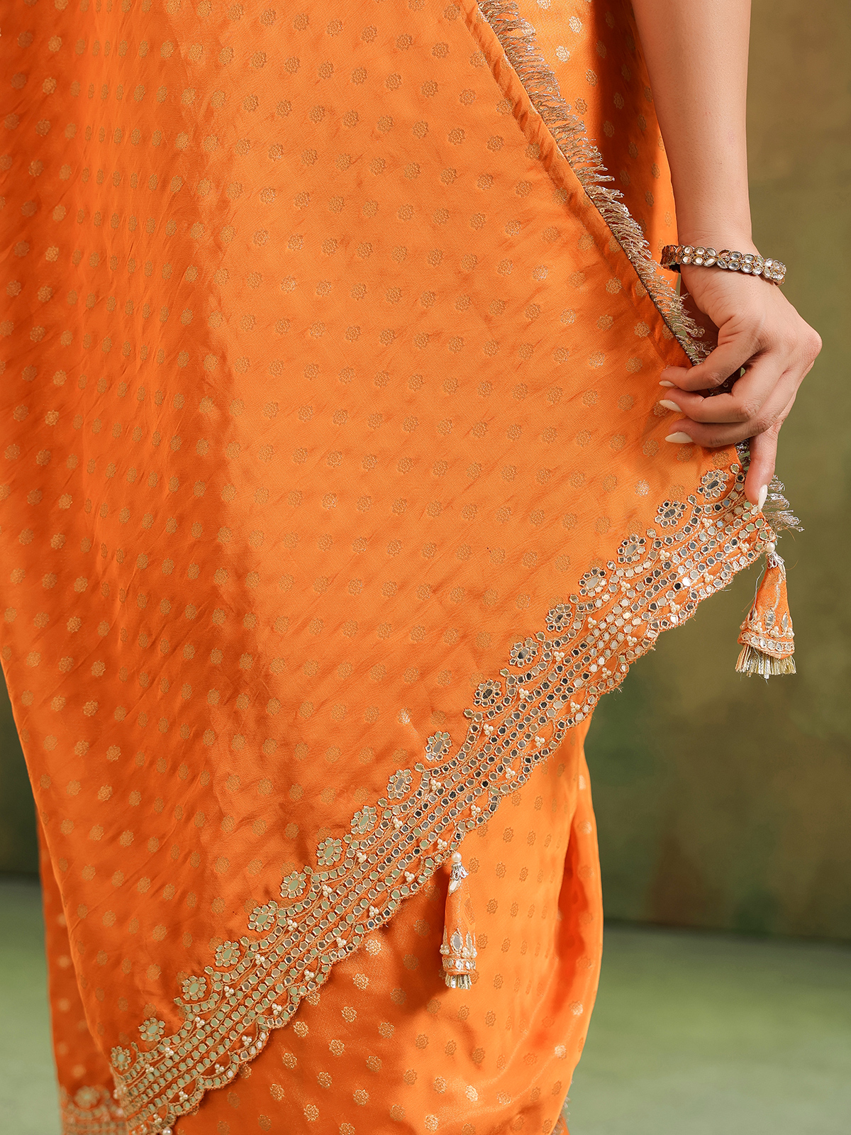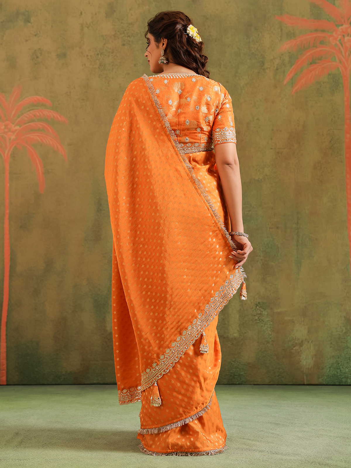 Orange silk radiates vibrant warmth, a hue of celebration and joy. Zari, resham, sequins, aabla, thread, and beads spread across its weave like artistic brushstrokes, breathing life into the drape. Styled with an unstitched blouse piece, this saree shines brightly for festive traditions and cultural gatherings.