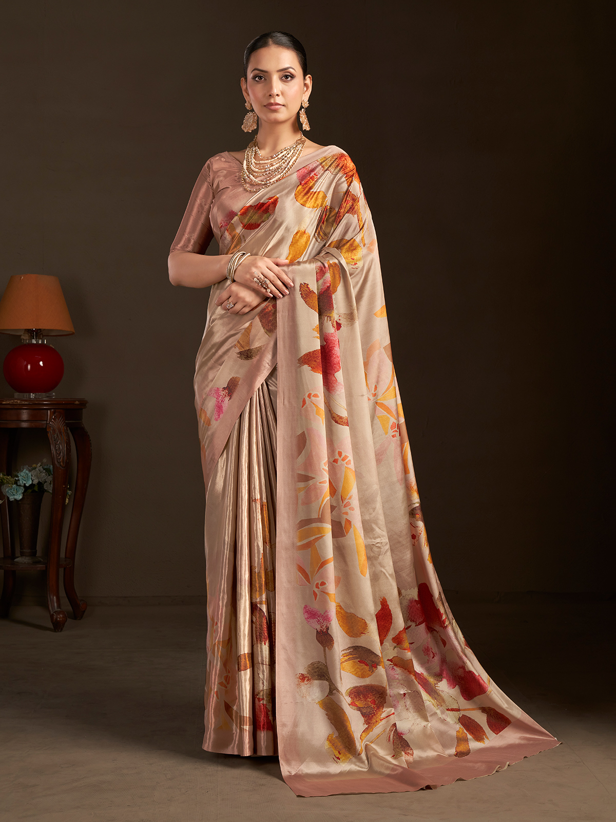 Minimal yet luxurious, this pastel beige ready to wear saree is designed with a smooth crepe finish and tasteful print detailing. The lightweight construction offers effortless movement, complemented by a discreet pocket feature. Styled with a coordinated ready blouse and elbow sleeves, it suits party, festive dinners, and formal celebrations.