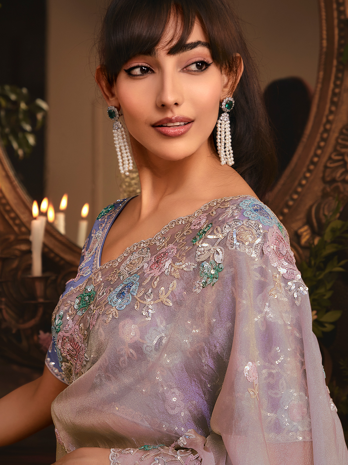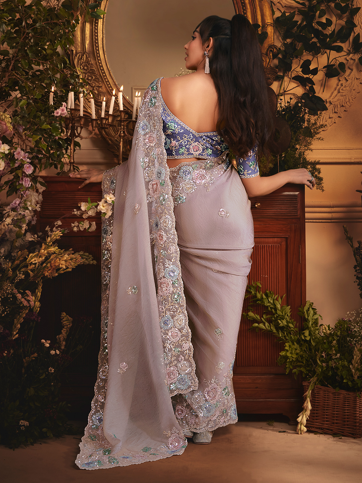 Pastel beige tissue organza drapes with soft luminosity, creating an aura of calm sophistication. Resham and sequins shimmer gently across the saree, forming graceful details that feel poetic and beautifully balanced. Paired with an unstitched blouse piece, it becomes an exquisite option for festive moments, serene wedding occasions, and polished receptions.