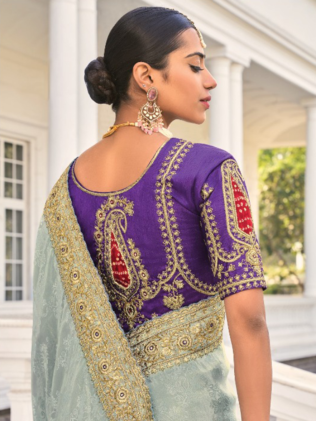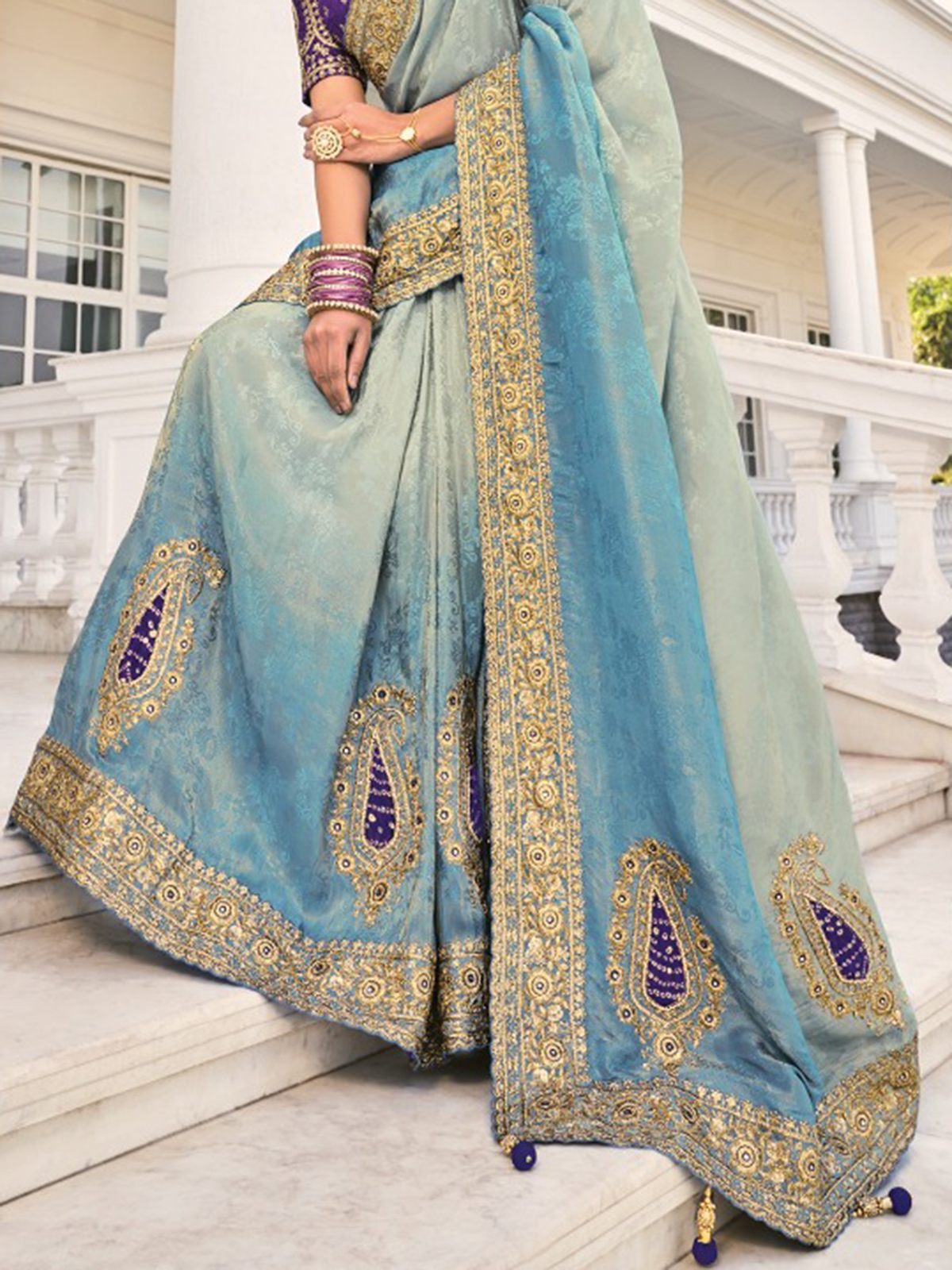Grace your special occasions in this pastel blue printed silk saree, highlighted with intricate zari, resham and aabla accents. Ideal for weddings and festive events, it includes an unstitched blouse for a personalized, elegant ethnic look.