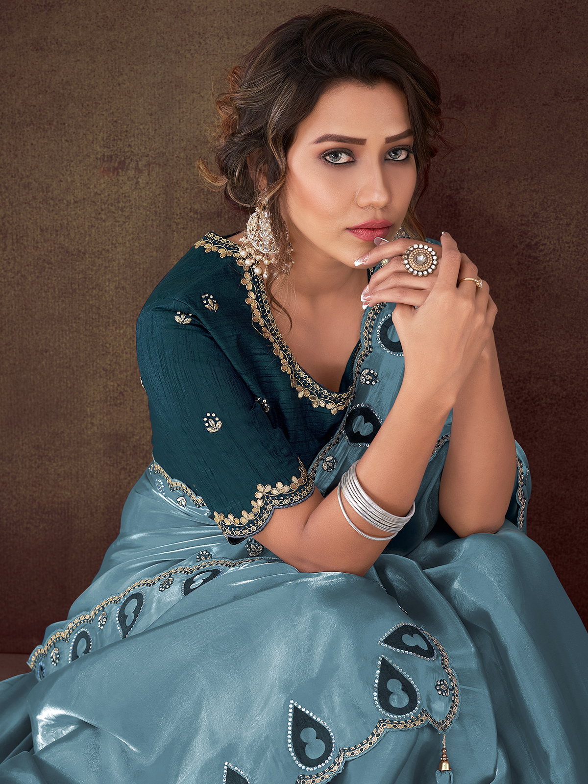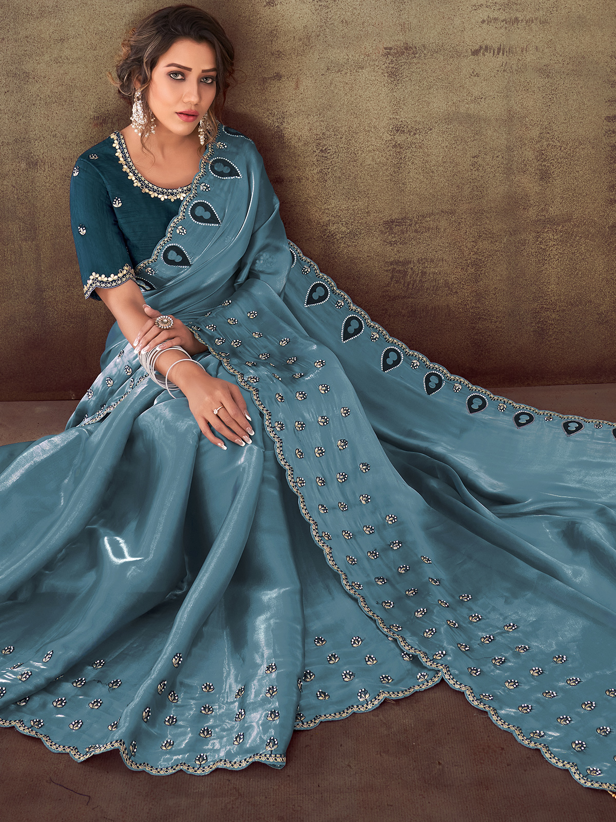Elevate your ethnic wardrobe with this pastel blue organza satin saree featuring exquisite hand-finished zari, stones and zardosi detailing. The luxurious sheen and airy silhouette offer effortless grace for weddings and festive evenings. Includes unstitched blouse fabric, allowing tailored perfection. Ideal for partywear, sangeet functions and special traditional gatherings.