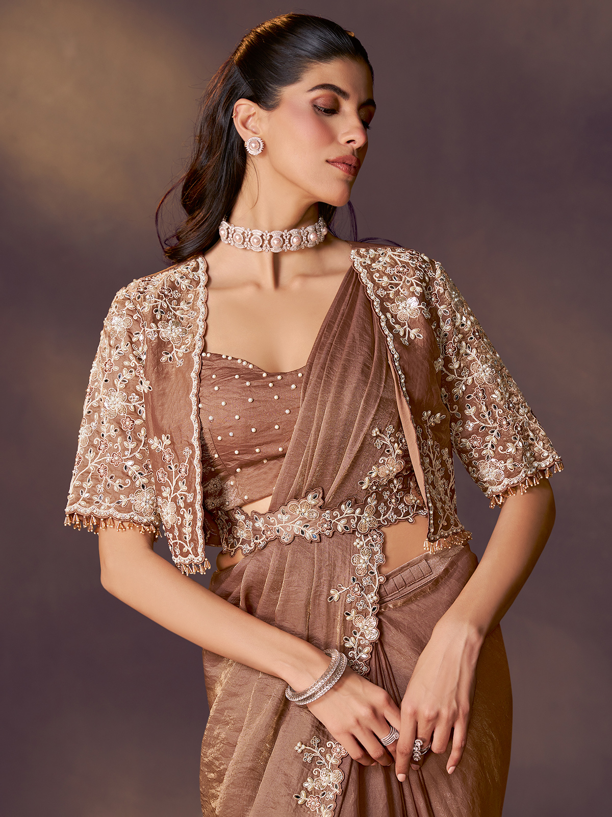 In soft pastel brown two-tone satin silk, this saree flourishes with embroidery, sequins, pearls, and diamond detailing. The jacket-style drape and waist belt bring a regal charm—perfect for wedding evenings and festive occasions.