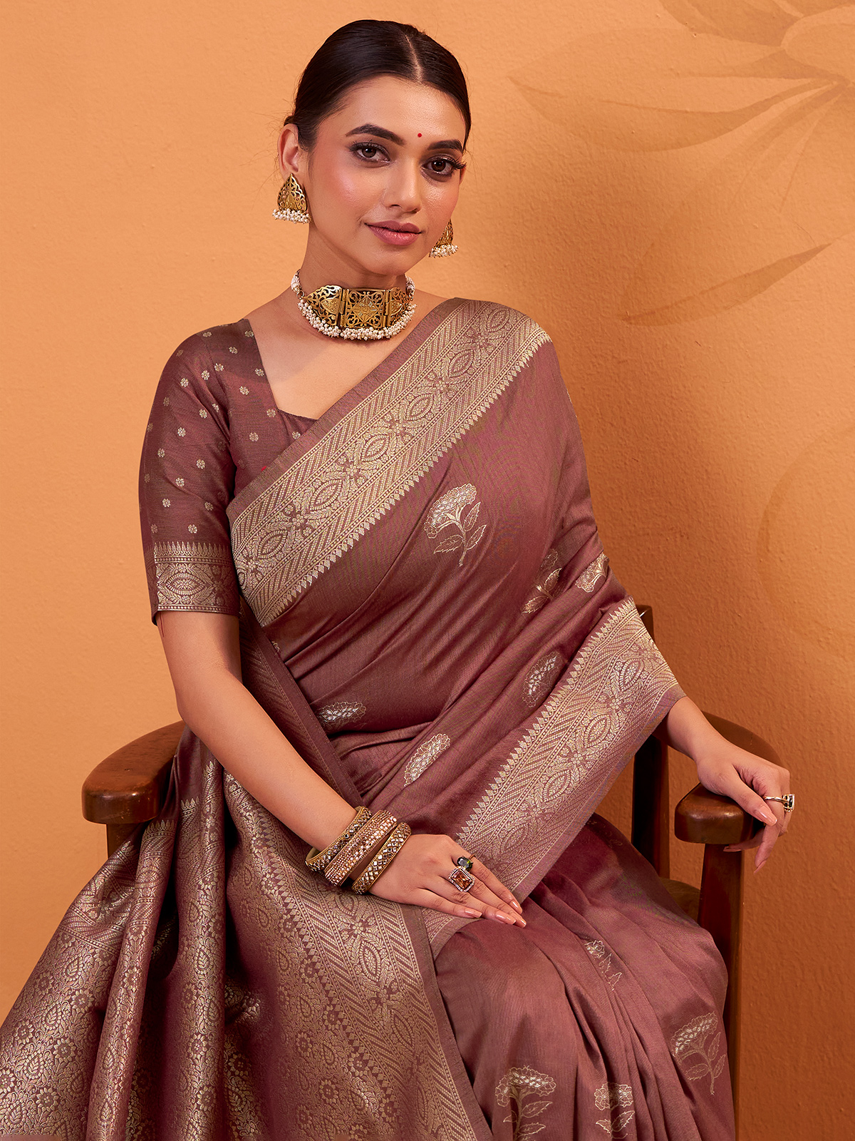 Crafted in serene pastel brown, this Tusser silk saree showcases fine zari weaves that exude quiet luxury. The soft sheen and elegant drape make it perfect for festive gatherings. Paired with an unstitched blouse piece for easy customization.