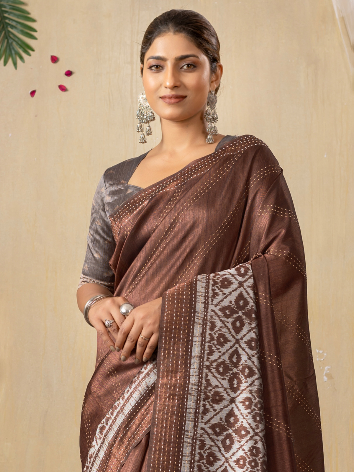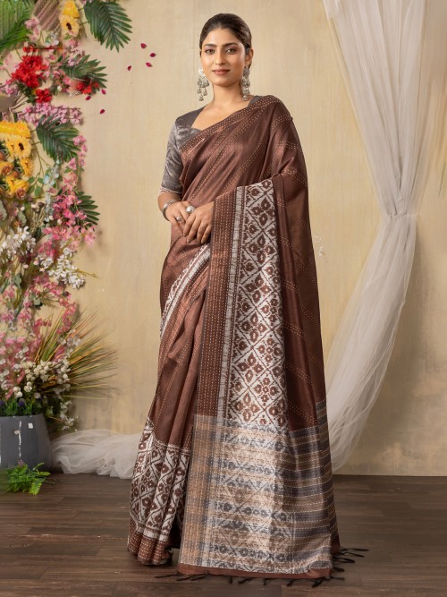 Add a touch of elegance to your wardrobe with this pastel coffee synthetic saree. Featuring a sophisticated print and crafted from soft, breathable fabric, it is an ideal pick for the contemporary woman. Comes with an unstitched blouse piece.