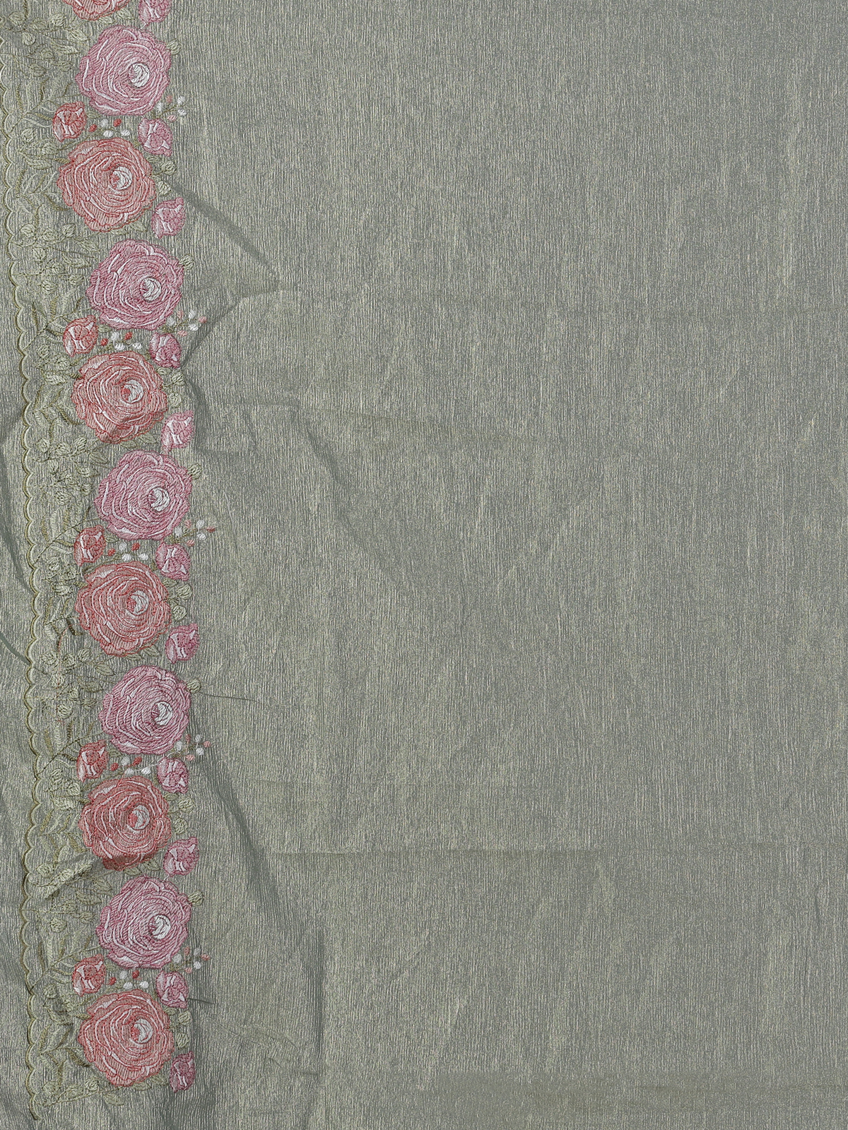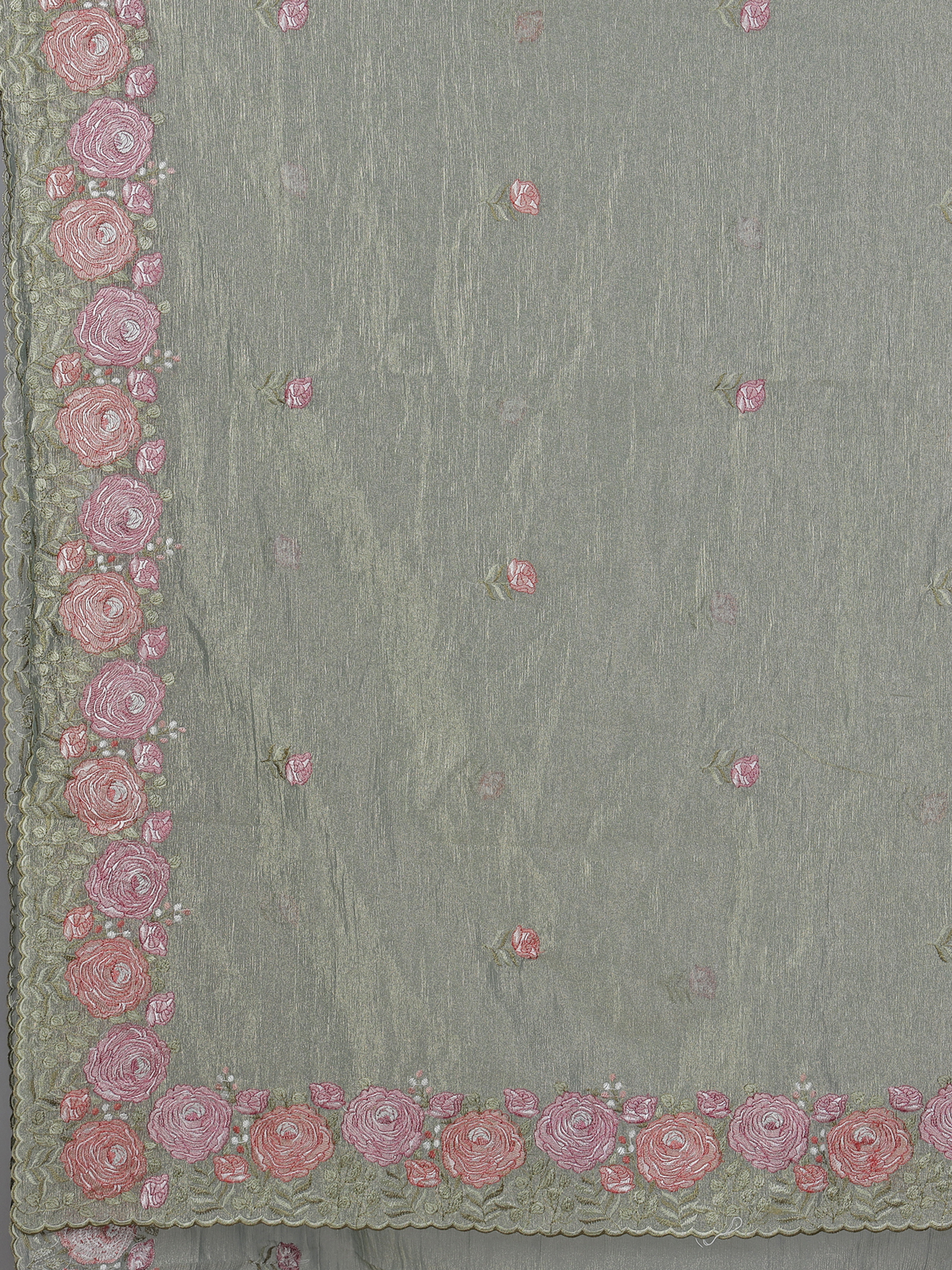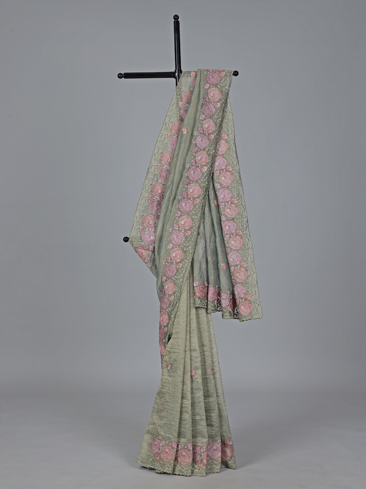Fresh and soothing pastel green cruss tissue saree is adorned with intricate embroidery that enhances its subtle shimmer. The airy drape and serene tone create a graceful festive presence. Ideal for celebrations. It is paired with an unstitched blouse piece for a beautifully tailored and elegant look.