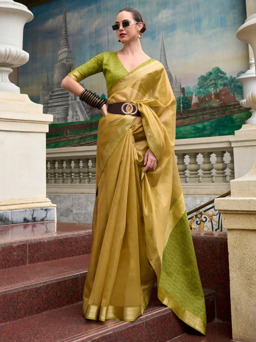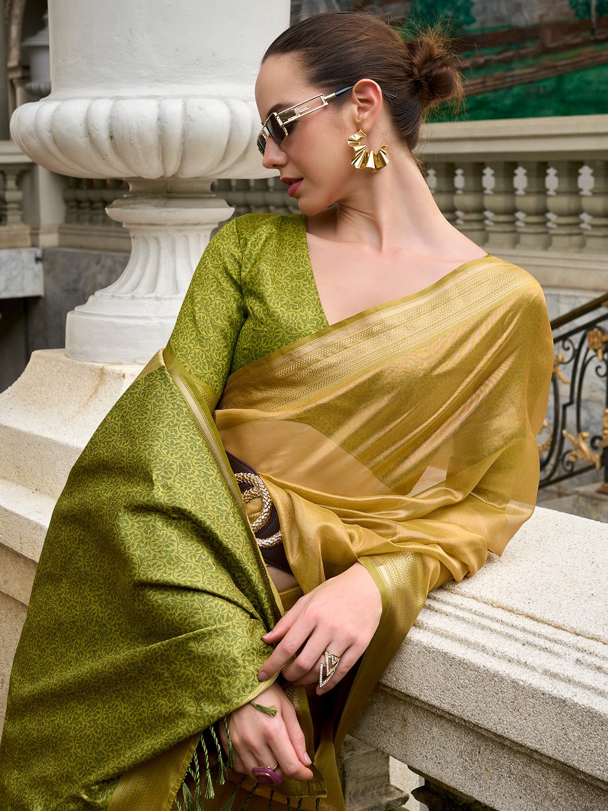 This pastel green tissue silk saree is perfect for any occasion. Its elaborate zari weaving, contrasting border, and tasseled pallu add to its decorative charm. includes a piece of unstitched blouse.