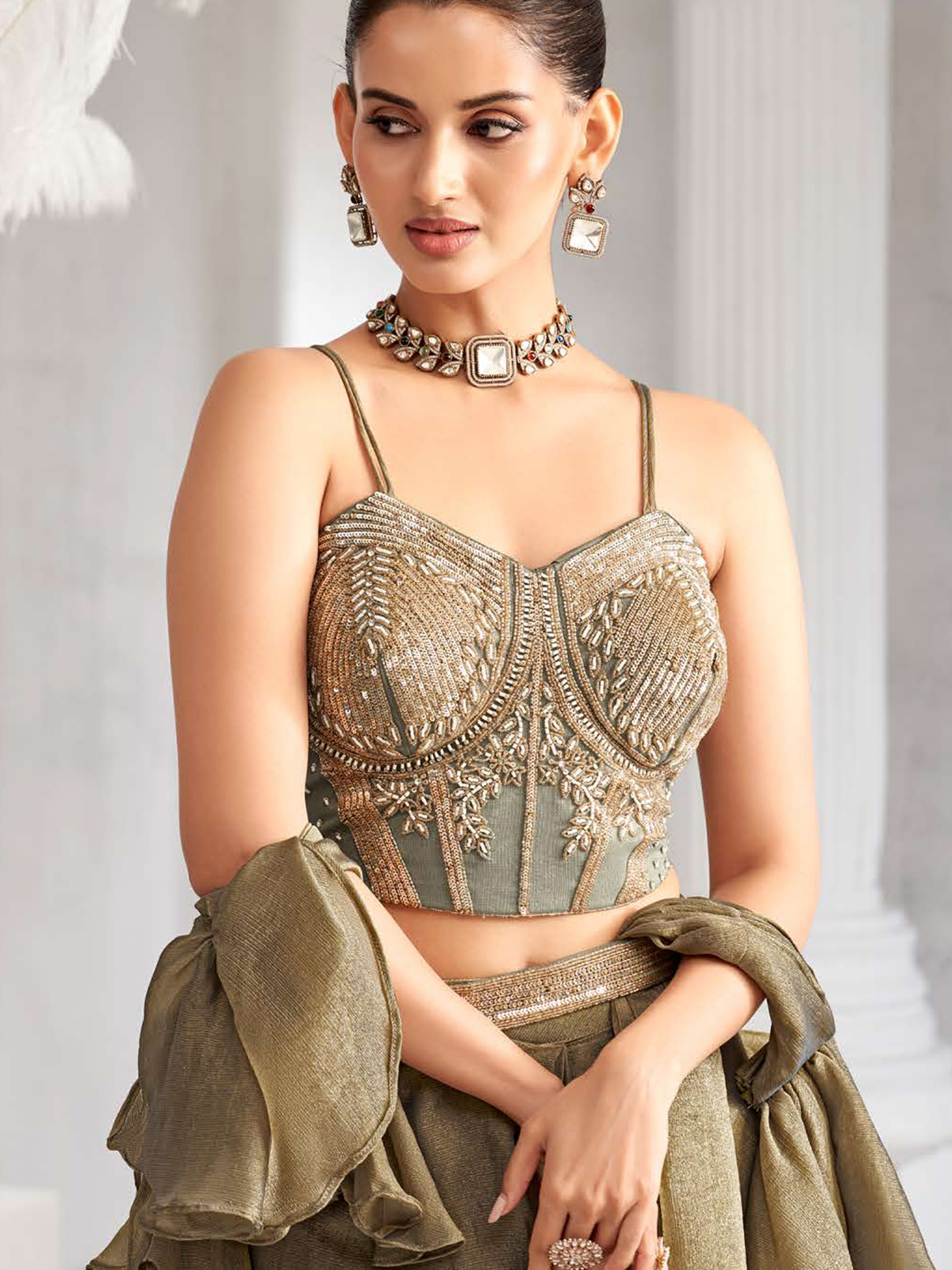 Cast in pastel mehendi green chiffon, this saree enchants with intricate cutdana, sequins, and bead detailing. The waist belt cinches the look with modern grace. Ideal for festive evenings and weddings, it balances serenity with statement-worthy allure.