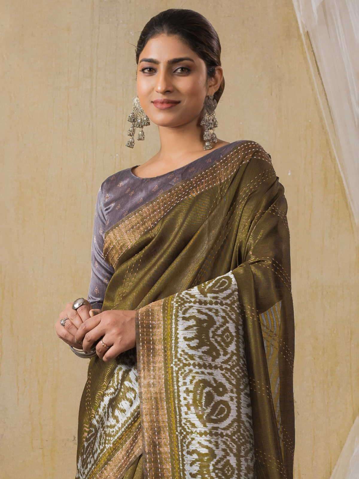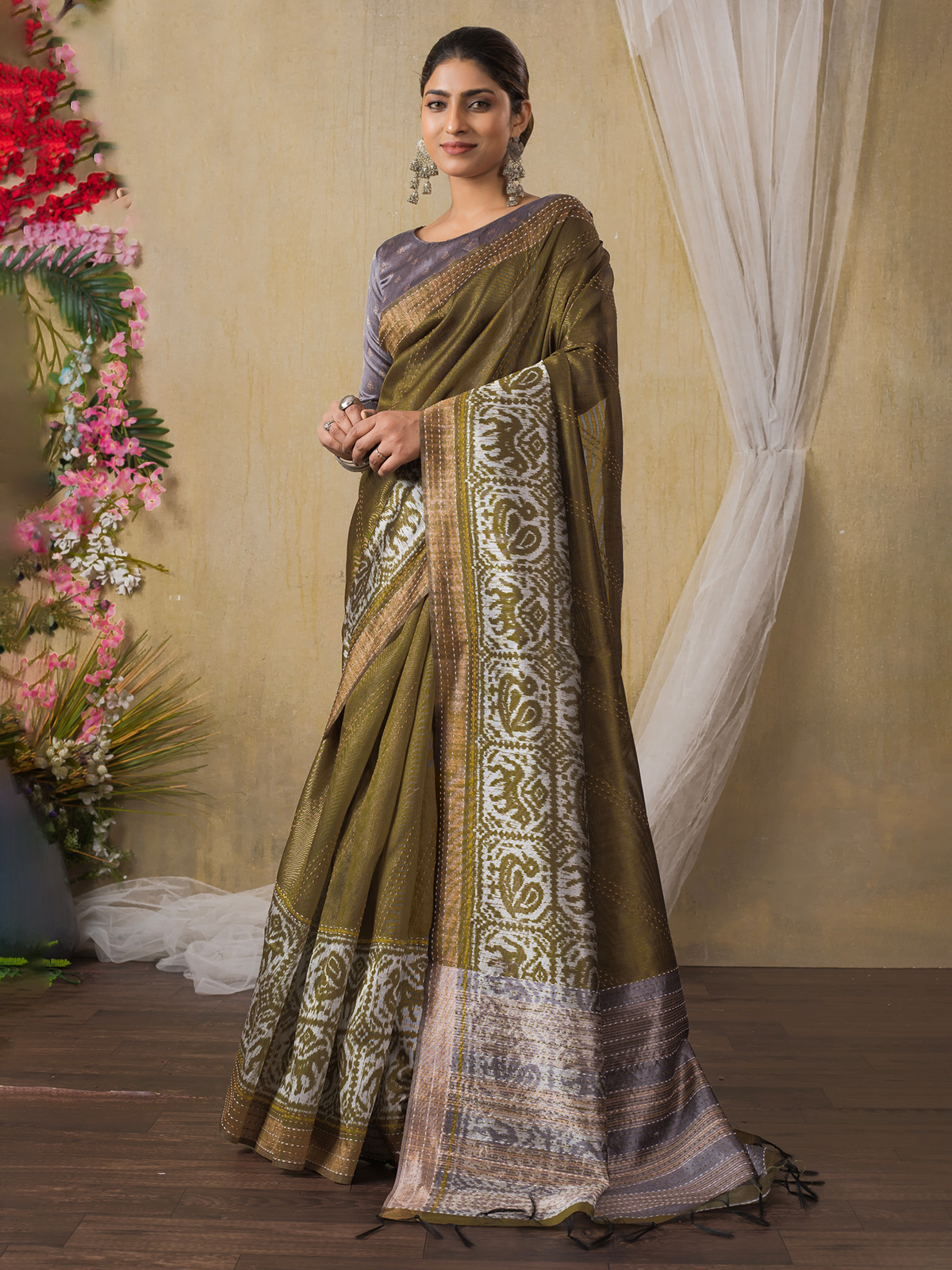 Make a statement with this stunning pastel olive synthetic saree, showcasing a captivating printed design. It effortlessly combines elegance with modern style and includes an unstitched blouse piece for a custom fit.