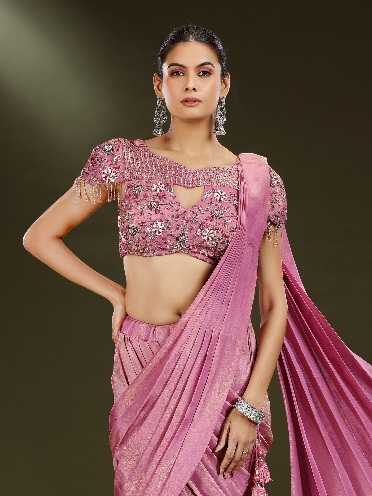 Embrace soft glamour with this pastel pink crepe silk saree, highlighted with radiant cutdana, sequins and bead embellishments. The soothing hue blends seamlessly with its designer artistry, creating a graceful modern appeal. Perfect for weddings, receptions and parties, it offers a chic, ready-to-wear elegance.