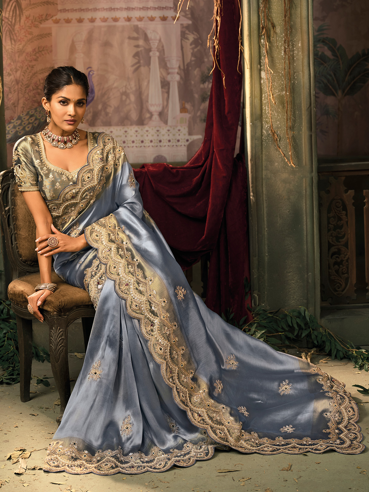 Exuding soft elegance, this pastel stone blue ziraf silk saree is perfect for grand celebrations. Detailed with cutdana, zardosi, sequins, zari, beads and stone work, it reflects luxurious craftsmanship. Ideal for weddings, sangeet and receptions, it includes an unstitched blouse piece for a customized fit.