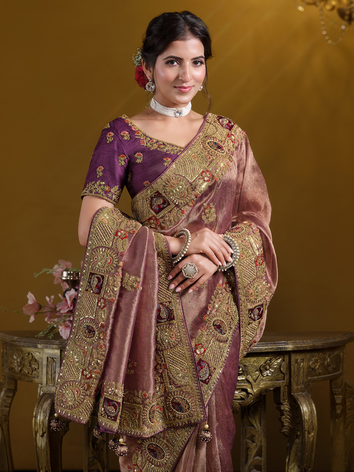 This pastel wine and gold saree in georgette and organza is adorned with intricate zari, cutdana, embroidery, beads, stones and sequins work. An ideal pick for weddings and festivities, with an unstitched blouse included.