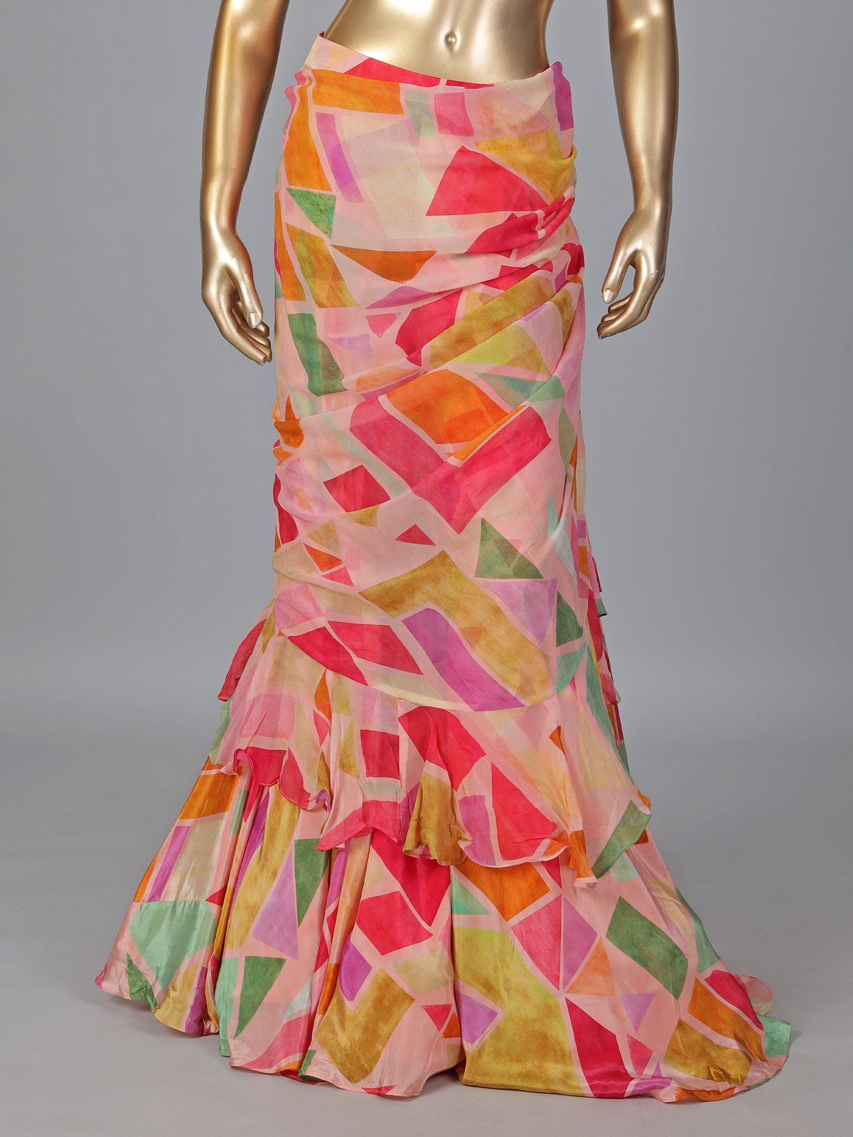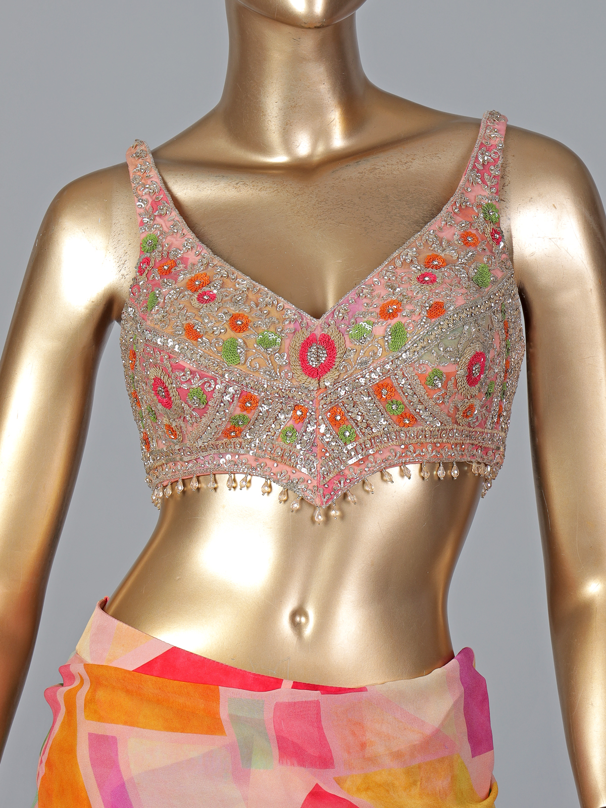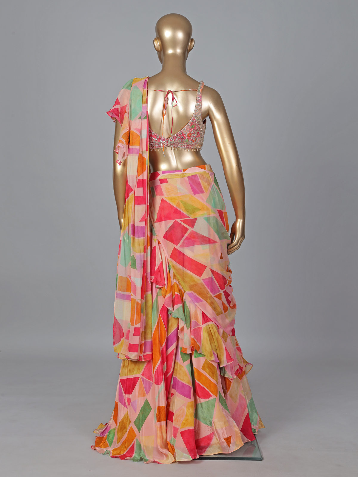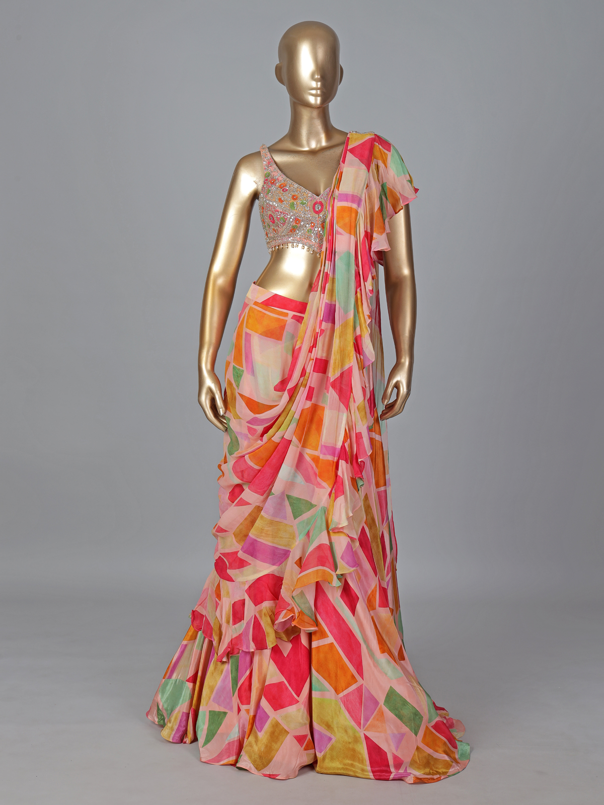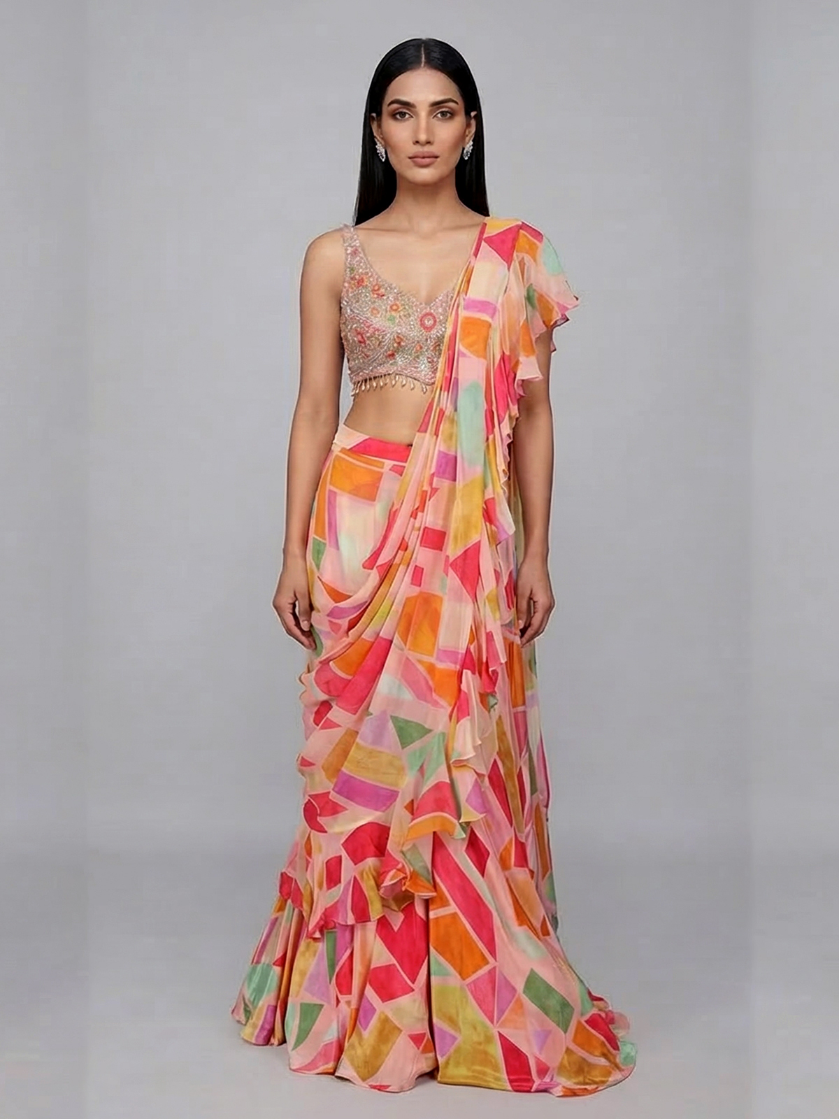 Delicate peach tones define this chiffon silk ready to wear saree, offering soft festive charm. The printed drape is enriched with cutdana, sequins, beads and diamond work, adding refined shimmer. Crafted for modern elegance, it creates a graceful look for parties and celebrations.