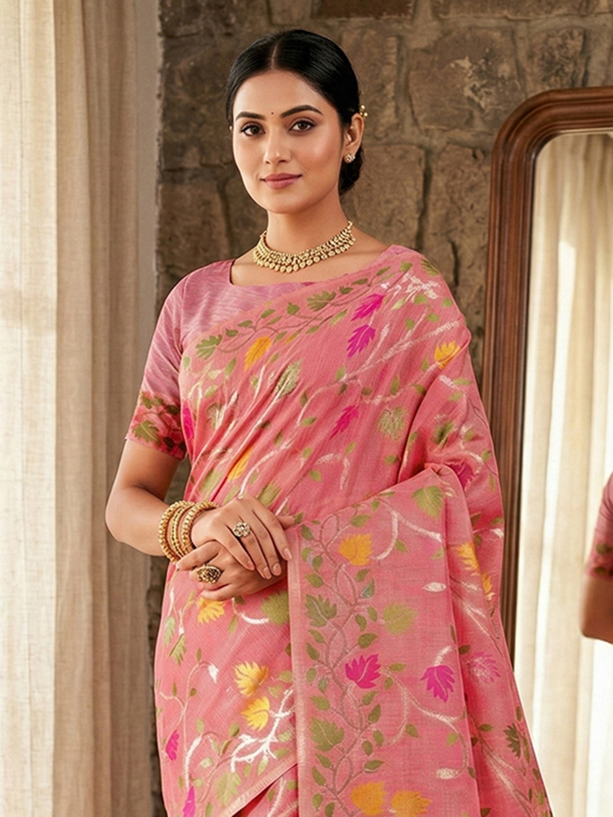 Warm and graceful, this peach-toned cotton linen silk saree features a delicate all-over floral design highlighted with mustard, beige, and olive leaf motifs. The saree is beautifully finished with a detailed border and tasseled pallu, adding a sophisticated touch. Completed with an unstitched blouse piece, it is perfect for weddings and traditional festive occasions.