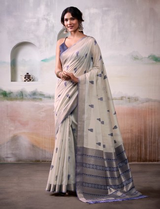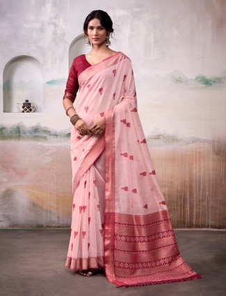 Elevate your grace with this light peach cotton saree, adorned with beautiful stylish motifs and a bold maroon border. Perfect for showcasing your refined style, it comes with an unstitched blouse piece to complete your elegant ethnic look.