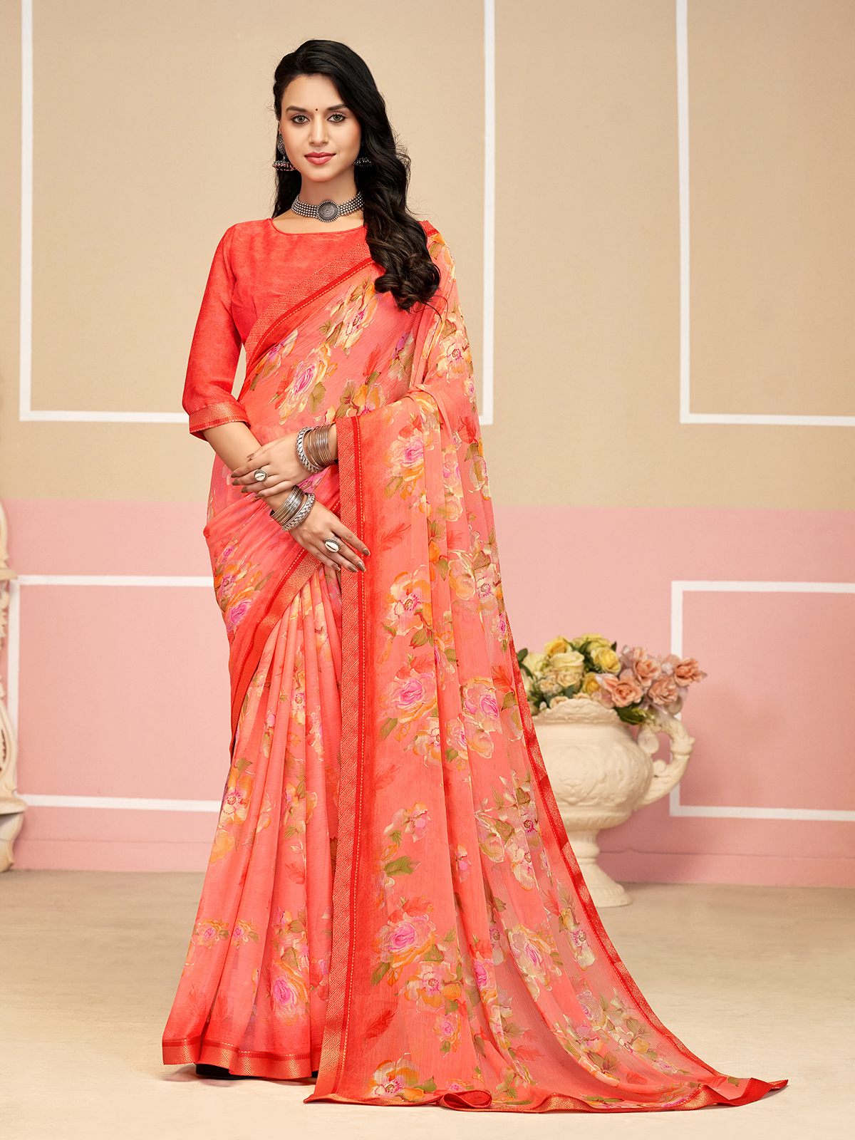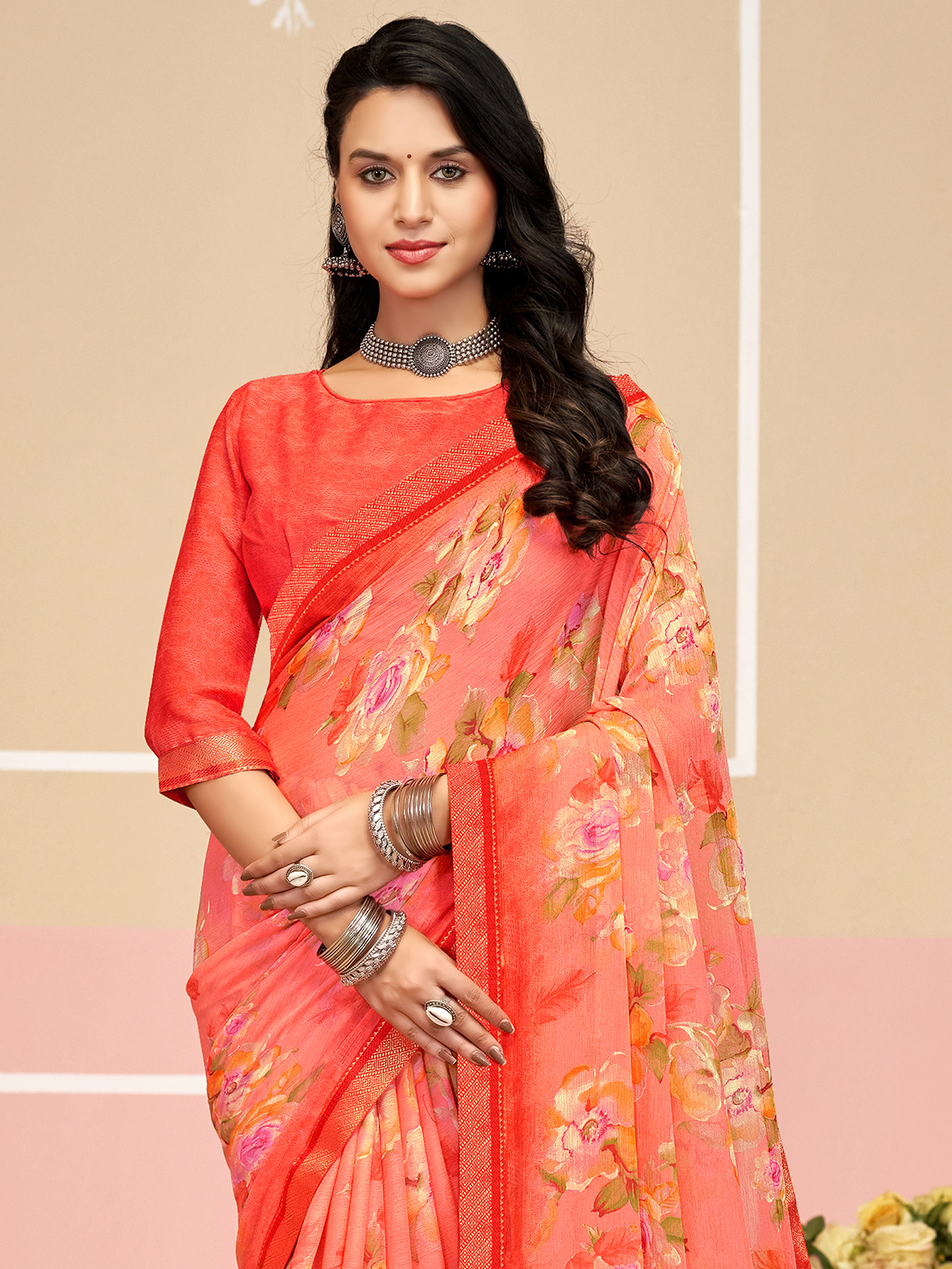 This graceful peach chiffon saree features elegant digital prints that create a soft and refreshing ethnic look. Finished with delicate lace detailing enriched with zari work along the borders, it drapes effortlessly with a lightweight feel. Paired with an unstitched matching blouse piece, it is perfect for festive wear, puja ceremonies and stylish casual occasions.
