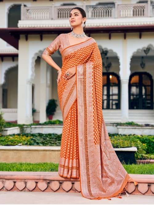 Soft and serene, this peach georgette saree is adorned with swarovskis and zari touches that offer delicate illumination. Ideal for weddings and party functions, it drapes effortlessly for a poised feminine look. Paired with an unstitched blouse, it brings elegance and ease to every special occasion.