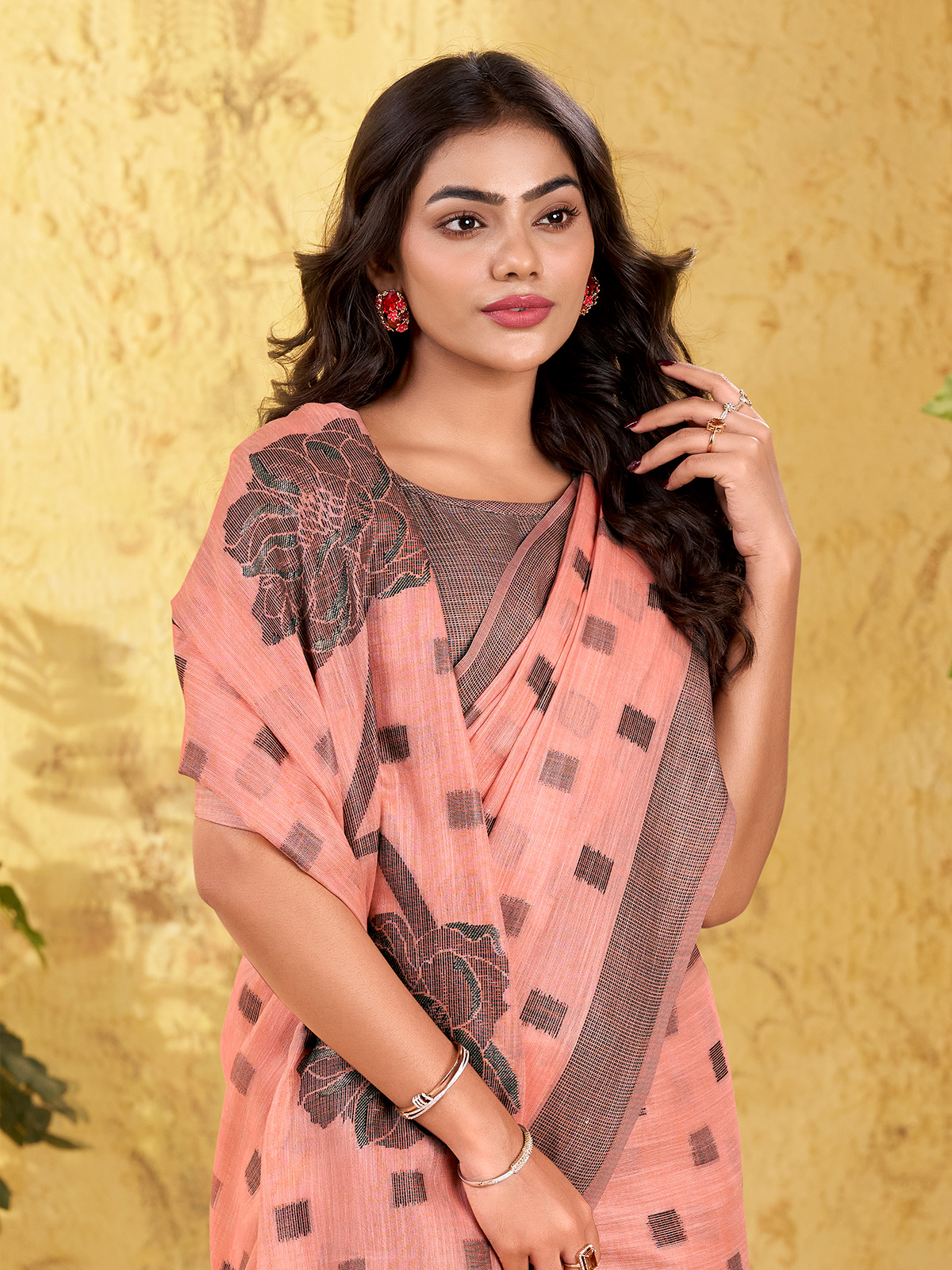 This charming peach linen silk saree is adorned with beautiful woven work that brings soft elegance to your festive and partywear wardrobe. Its breathable texture and graceful fall ensure effortless comfort. The saree comes with an unstitched blouse, giving you complete freedom to design your ideal ethnic ensemble.
