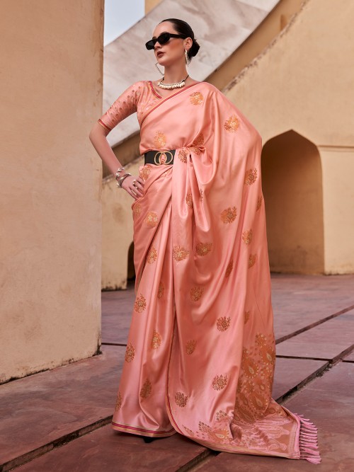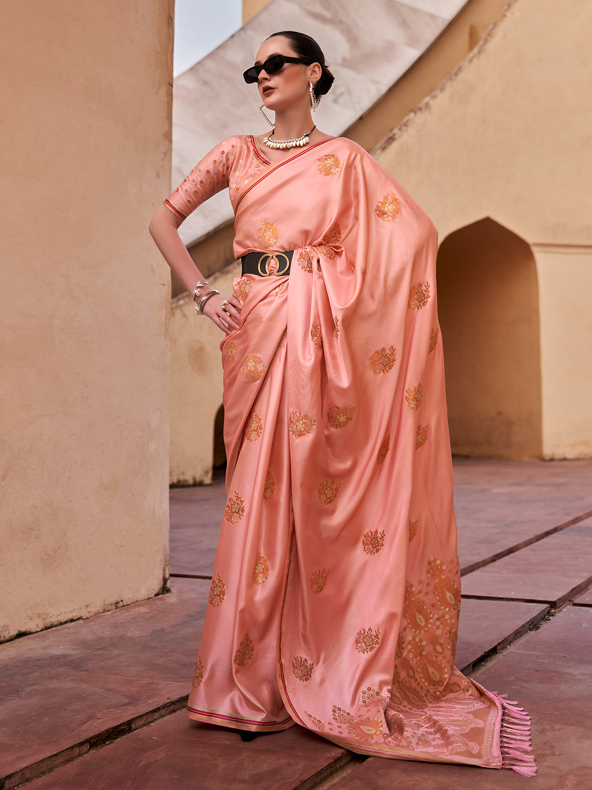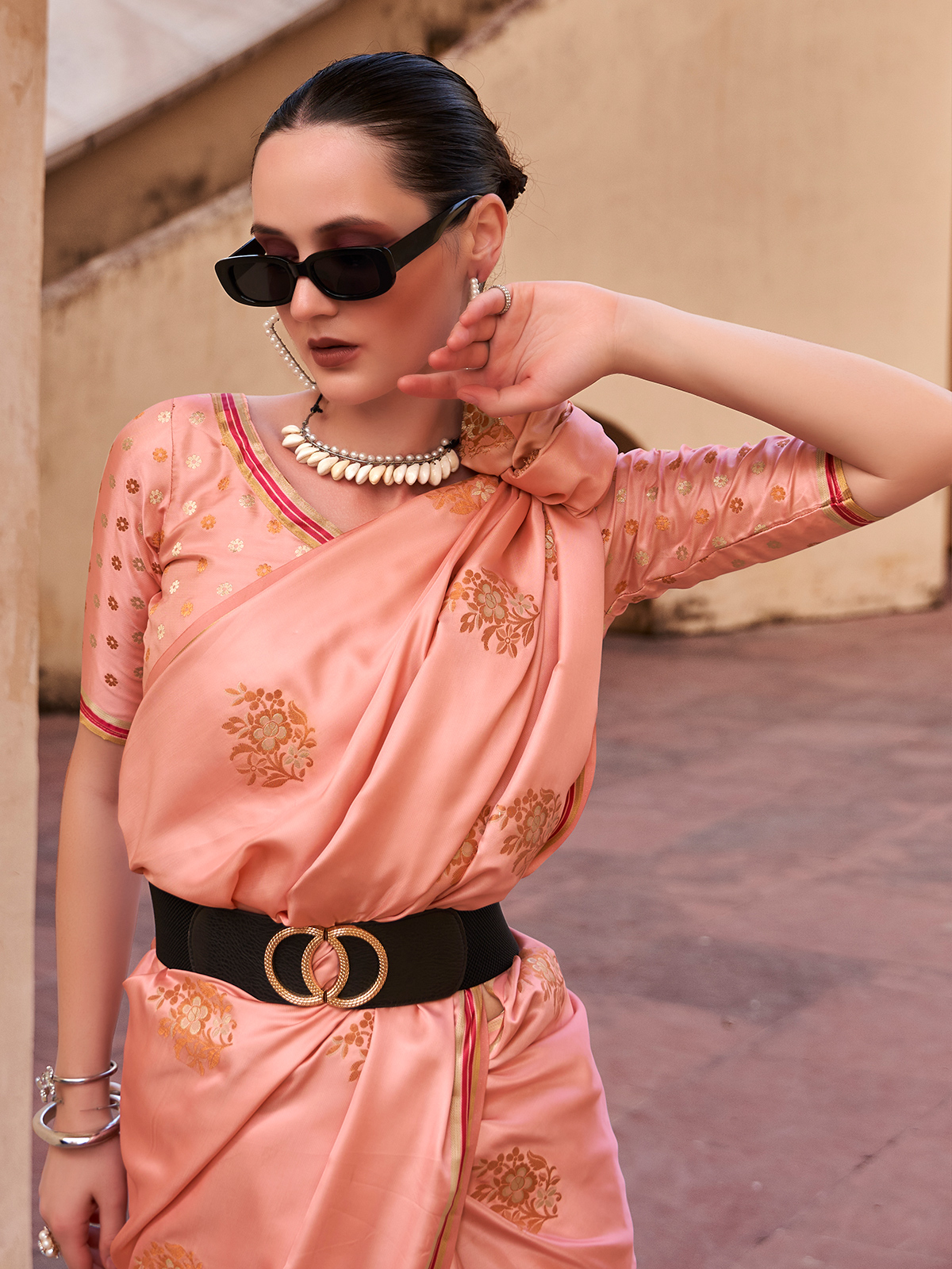 Draped in soft peach, this satin silk saree is enhanced with delicate zari weaving, perfect for wedding and festive occasions. Its lustrous fall exudes classic charm. With an unstitched blouse piece, it offers personalized styling to create a graceful and versatile ethnic attire.