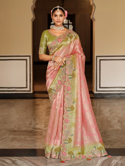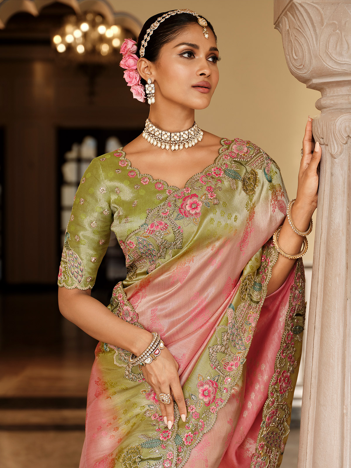 A shaded peach silk saree radiates warmth and refinement, designed for joyous wedding and festive occasions. Resham, stone, and sequins work sparkle across the delicate fabric, enhancing its luminous tone. Teamed with a pista green unstitched blouse piece, it reflects artistic grace and timeless beauty, draping with poetic elegance and cultural richness in every fold.