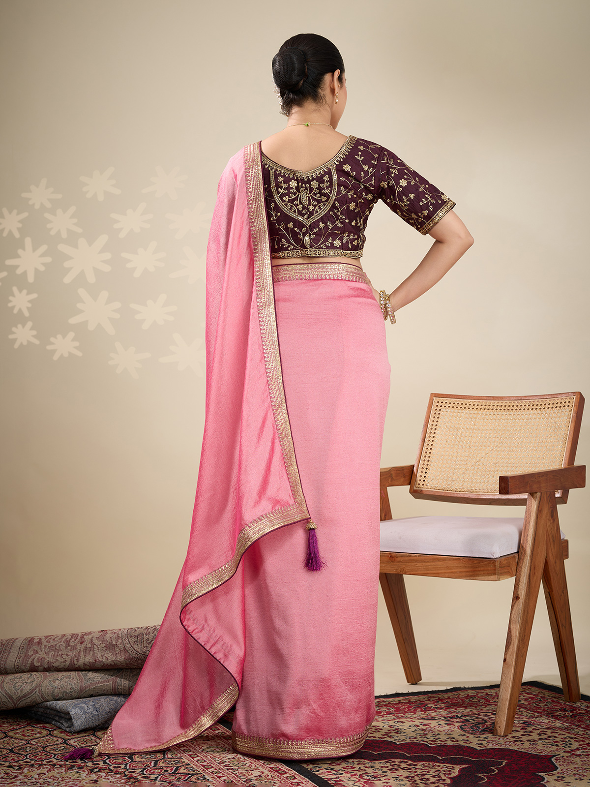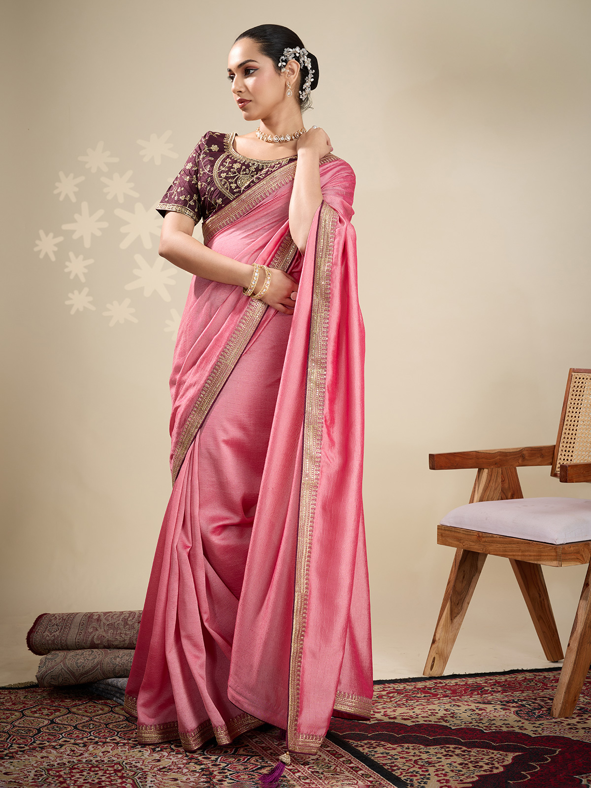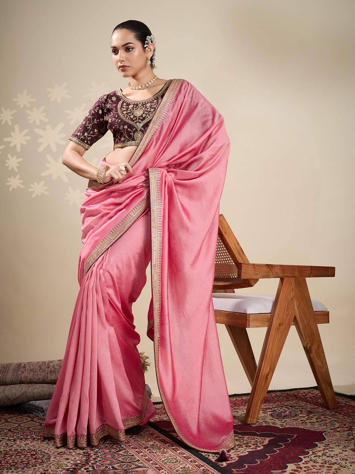 Pastel toned silk flows gracefully in this saree, exuding subtle sophistication and elegance. Resham and sequins add a luminous shimmer along the border, like sunlit strokes across the weave. Offered with an unstitched contrast blouse piece, it is ideal for festivals and parties, curating soft charm with modern artistry.