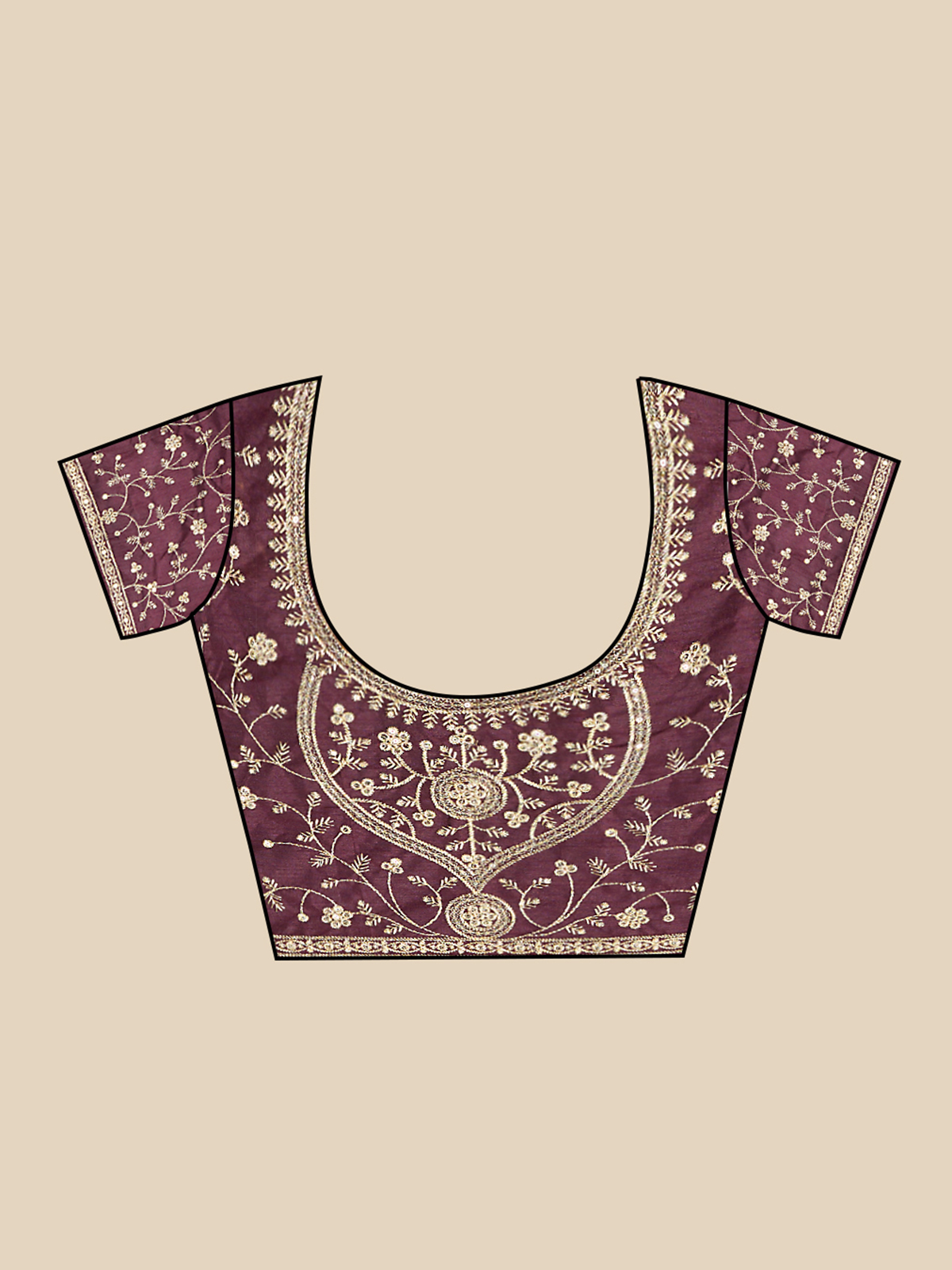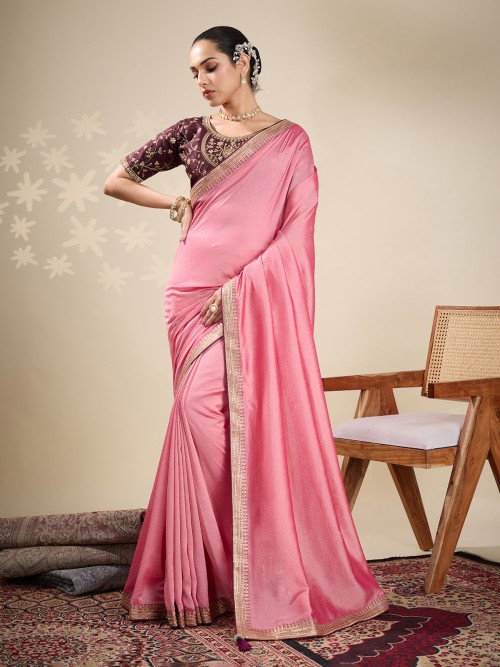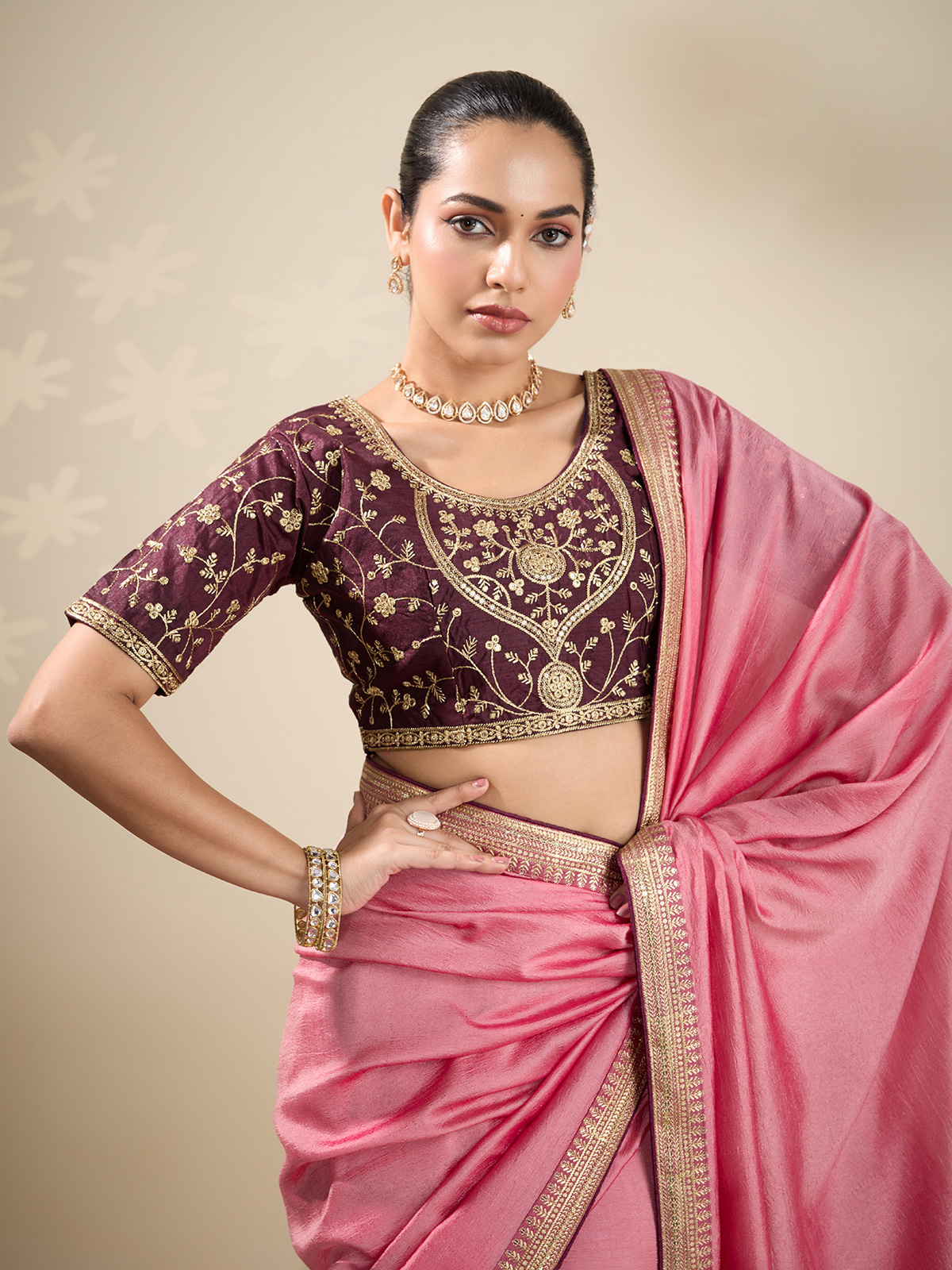 Pastel toned silk flows gracefully in this saree, exuding subtle sophistication and elegance. Resham and sequins add a luminous shimmer along the border, like sunlit strokes across the weave. Offered with an unstitched contrast blouse piece, it is ideal for festivals and parties, curating soft charm with modern artistry.