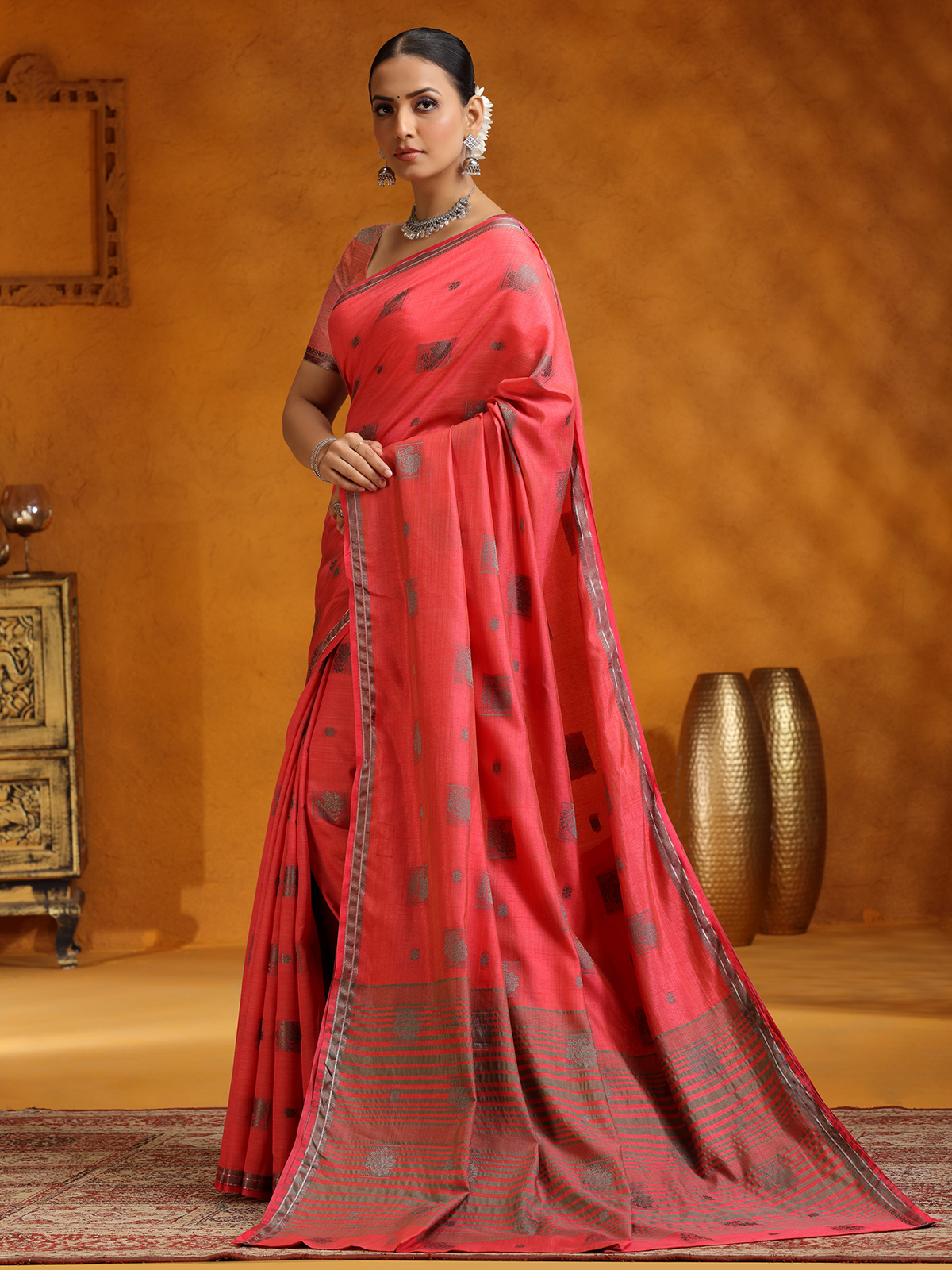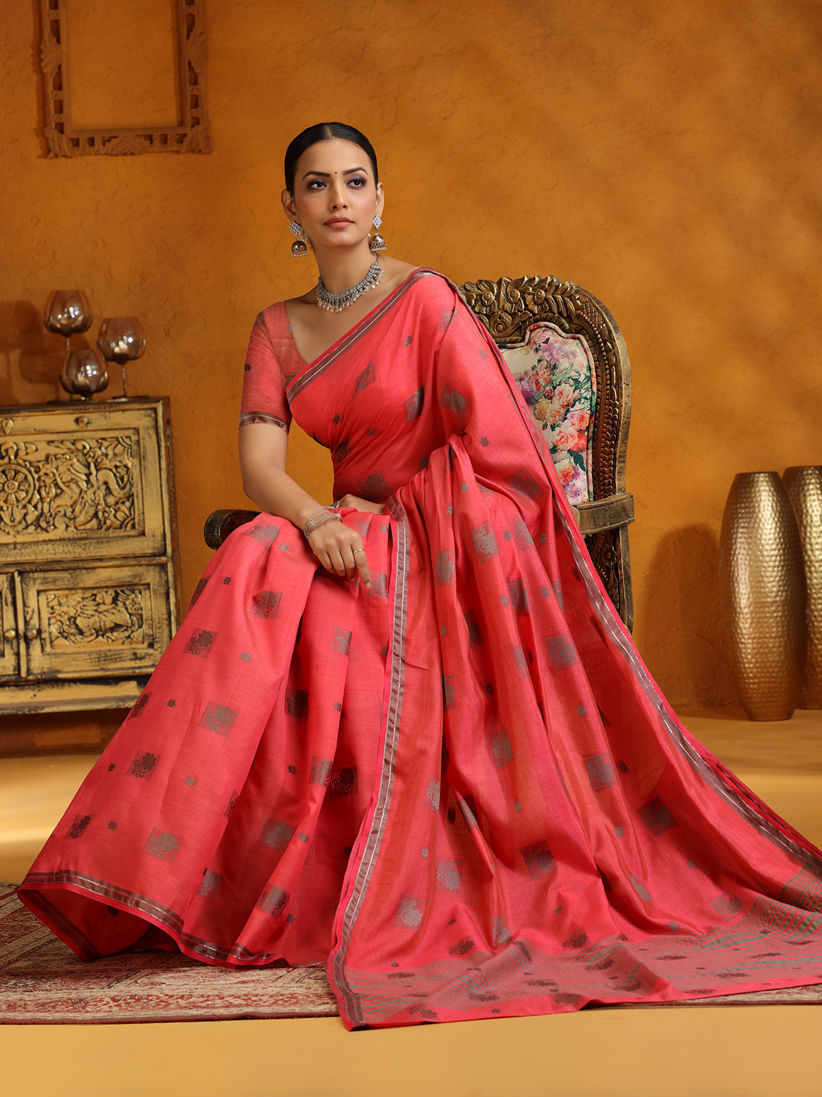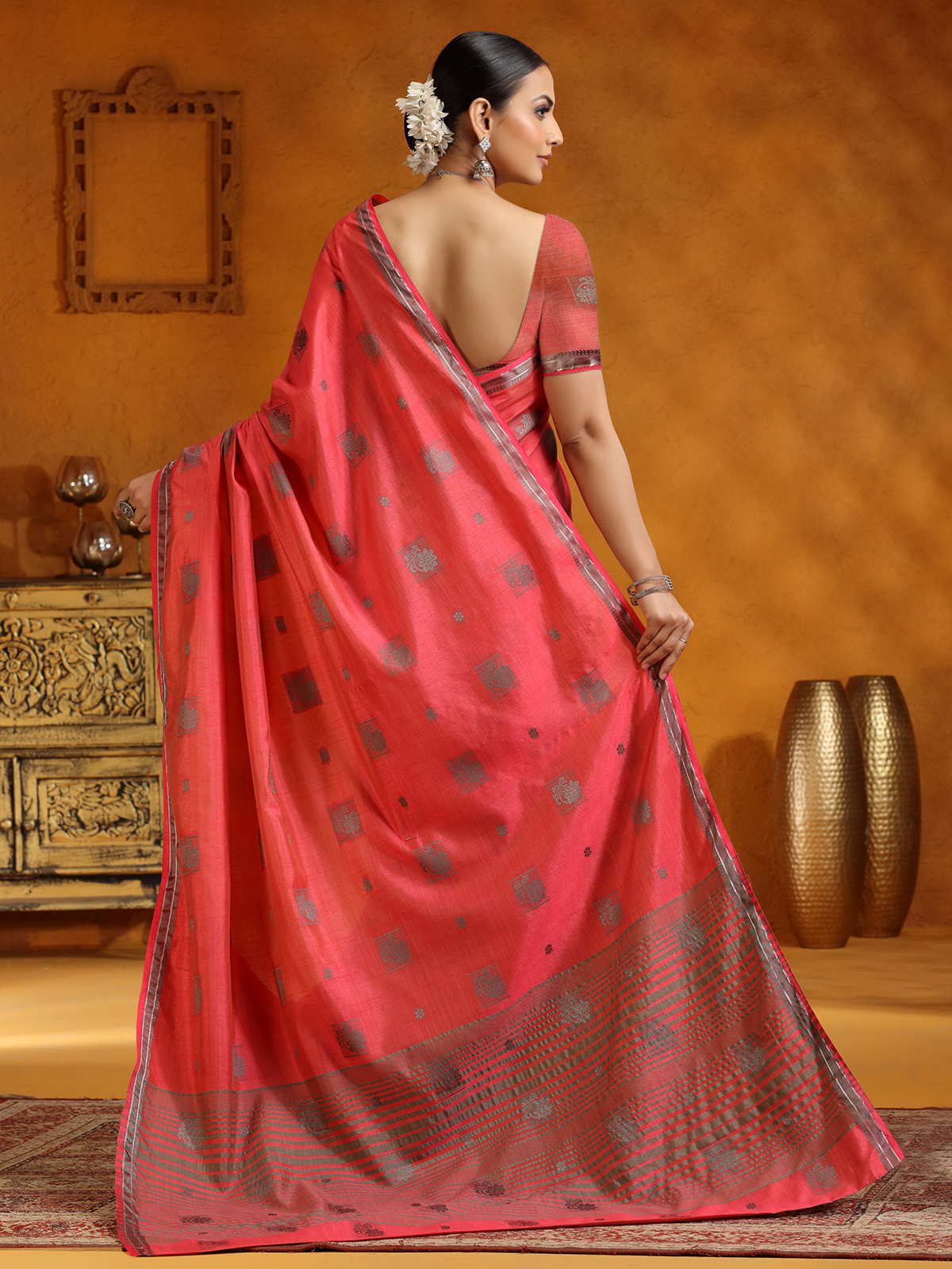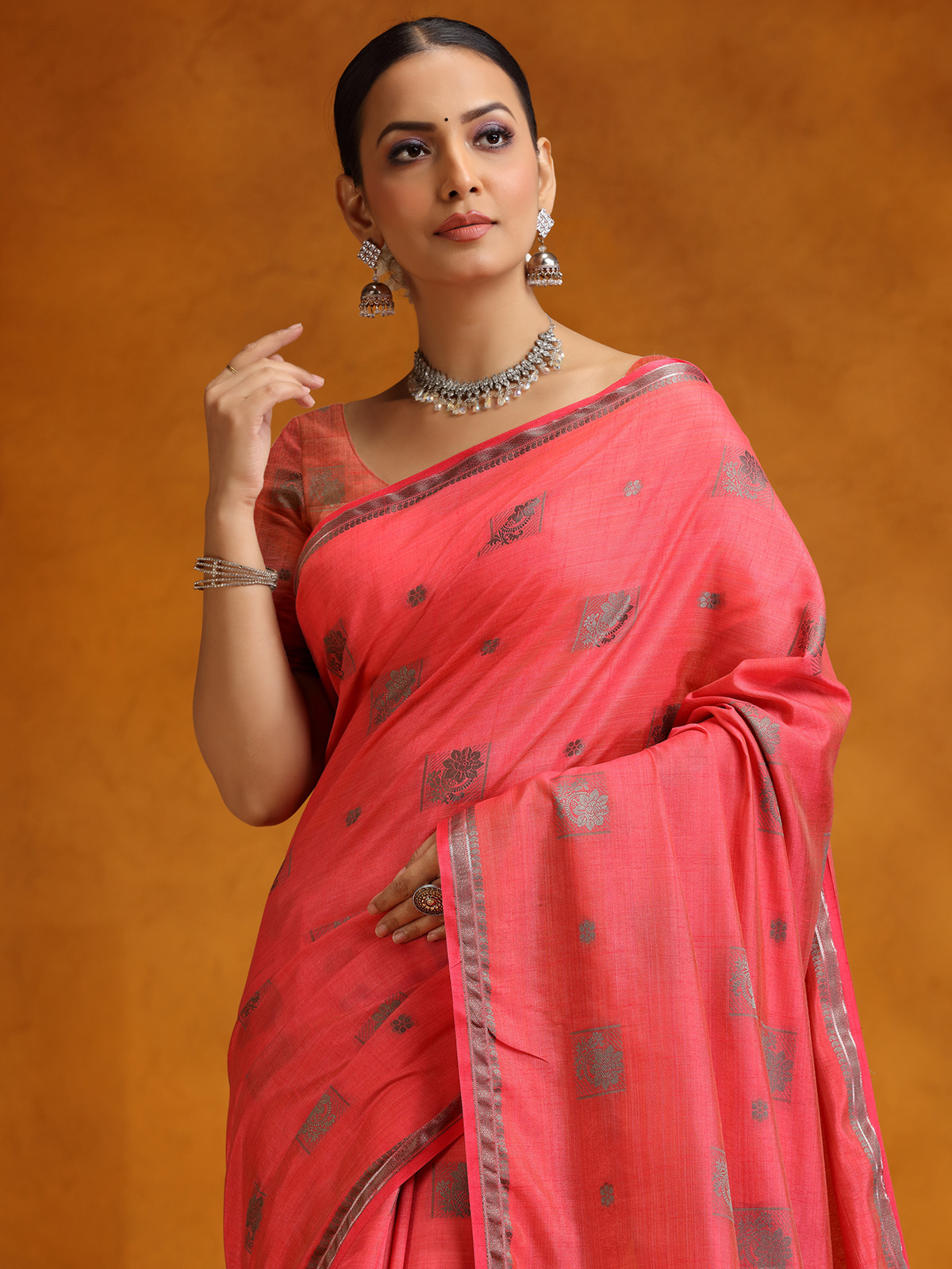 Be bold in this beige silk saree, highlighted with golden zari weaving. Modern yet classic, with an unstitched blouse for personalized style.