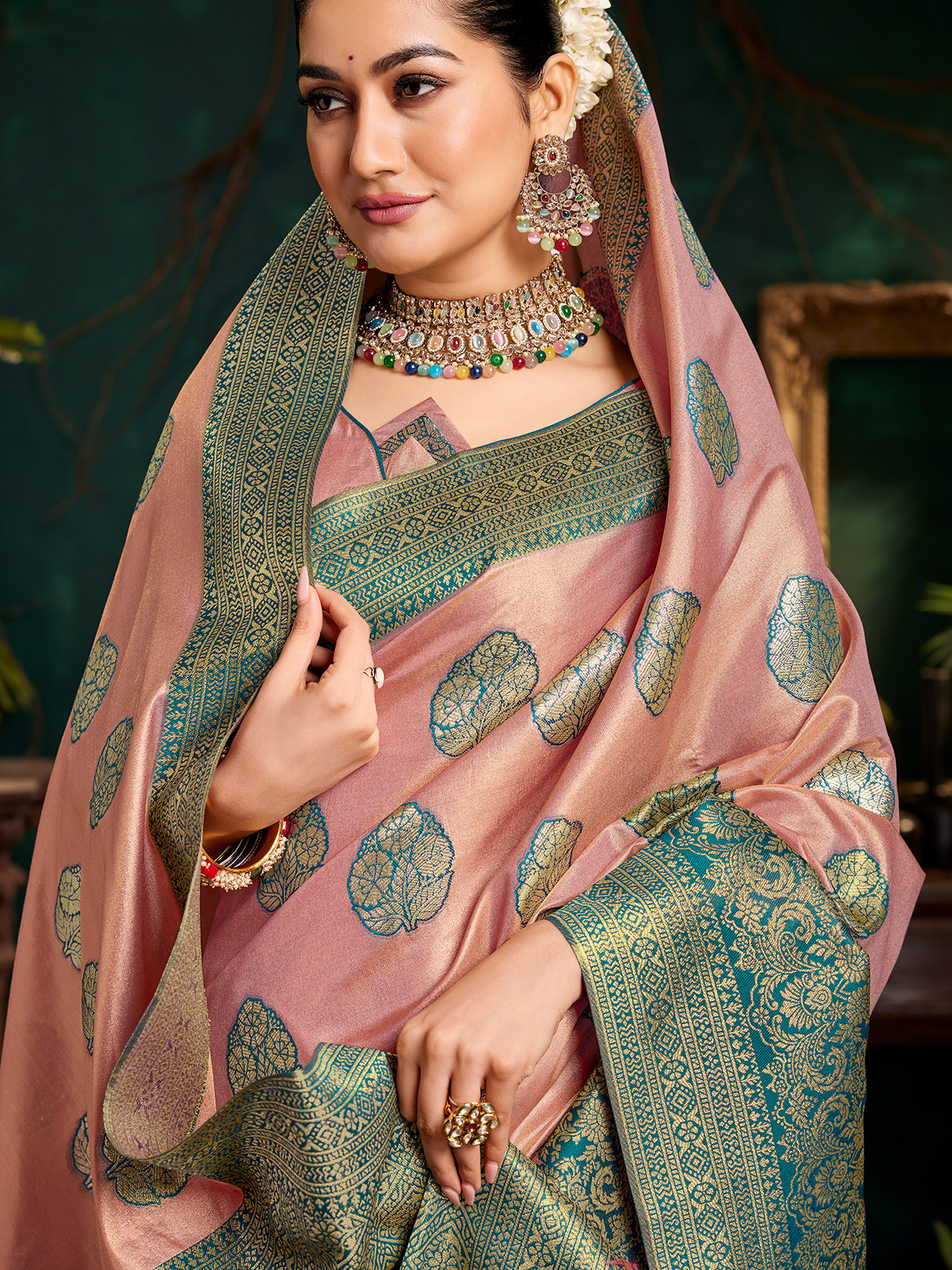 Elegant in peach dyed silk, this saree features intricate zari floral motifs and classic traditional designs spread across the fabric. The wide border and detailed pallu enhance its graceful appeal. It comes with an unstitched blouse, making it ideal for festive gatherings and wedding celebrations.