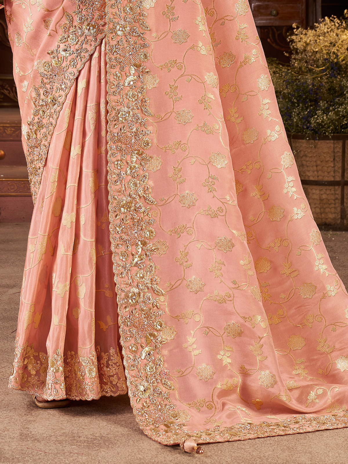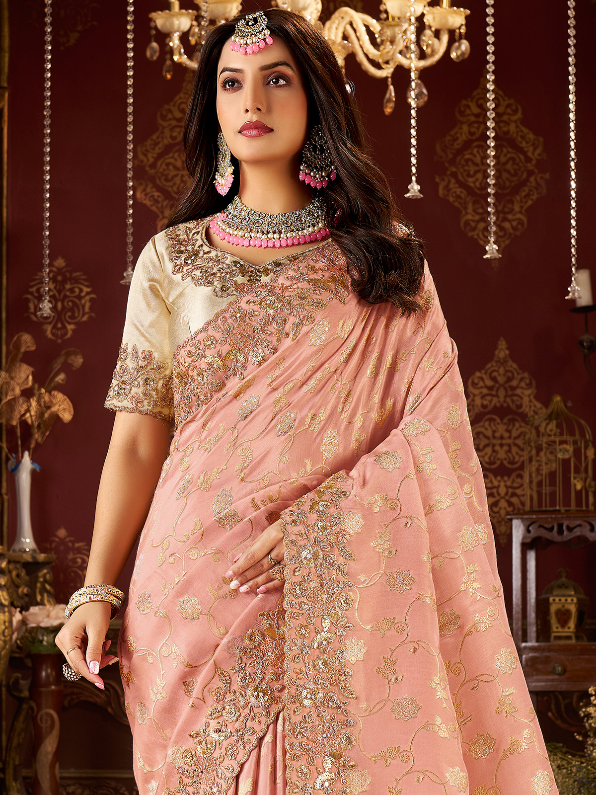 This peach soft silk saree is adorned with rich embroidery, sequins, mirror work, stone, zardosi, and zari. Paired with a contrast unstitched blouse piece, it is ideal for weddings, receptions, and festive occasions.