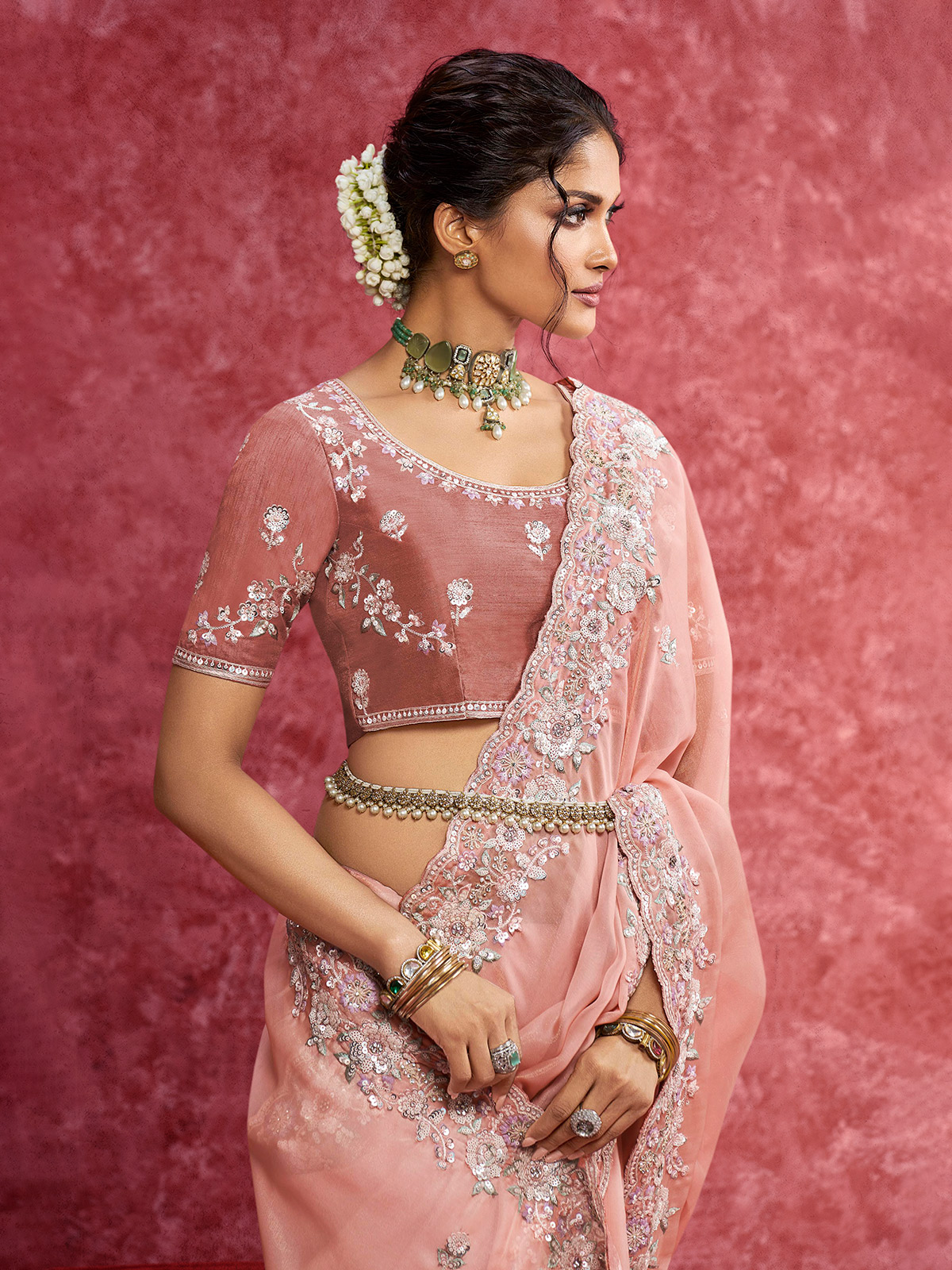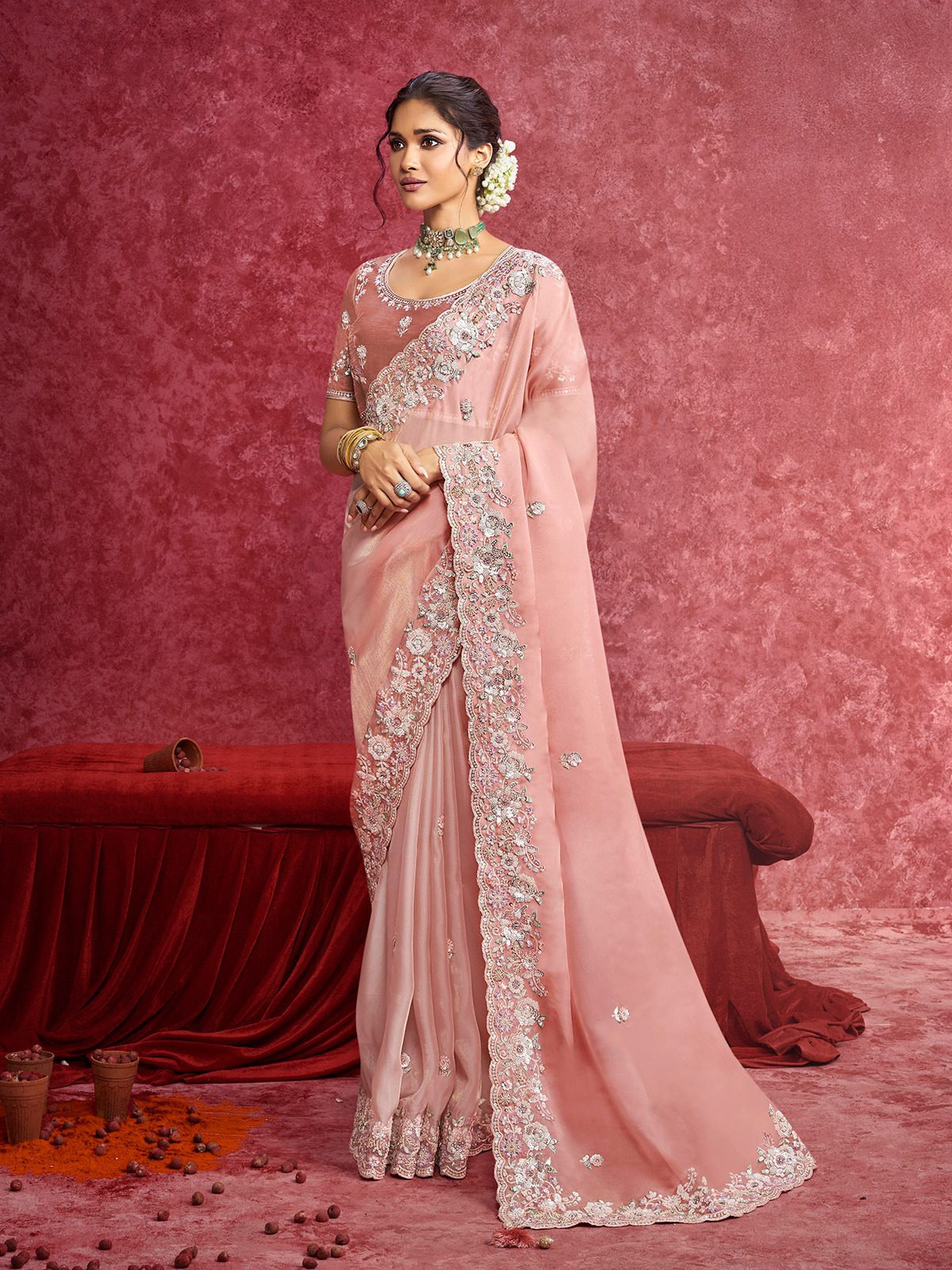 Peach Tissue Silk Saree Adorned With Resham Detailing