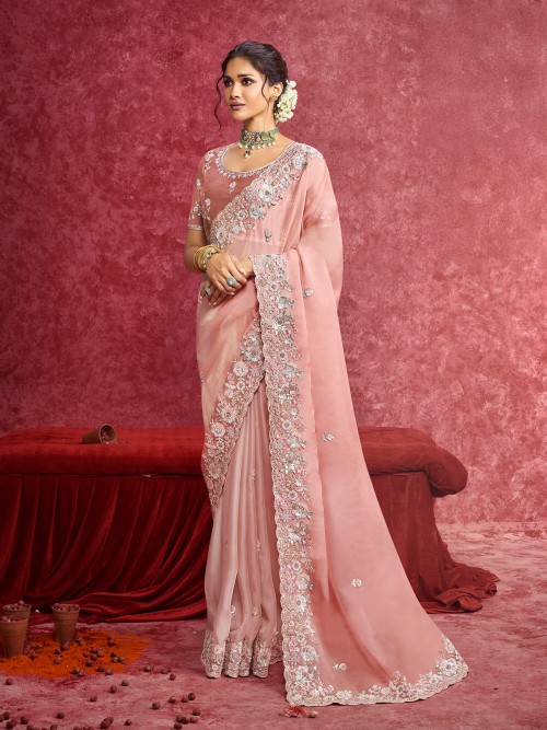 Glowing like a serene sunrise, this peach tissue silk saree reflects warmth and radiance. Its resham and sequins work adds a shimmering delicacy, ideal for festive gatherings and wedding moments. The lightweight fabric enhances its elegance, while the unstitched blouse piece allows you to personalize your ensemble with artistry and sophistication.