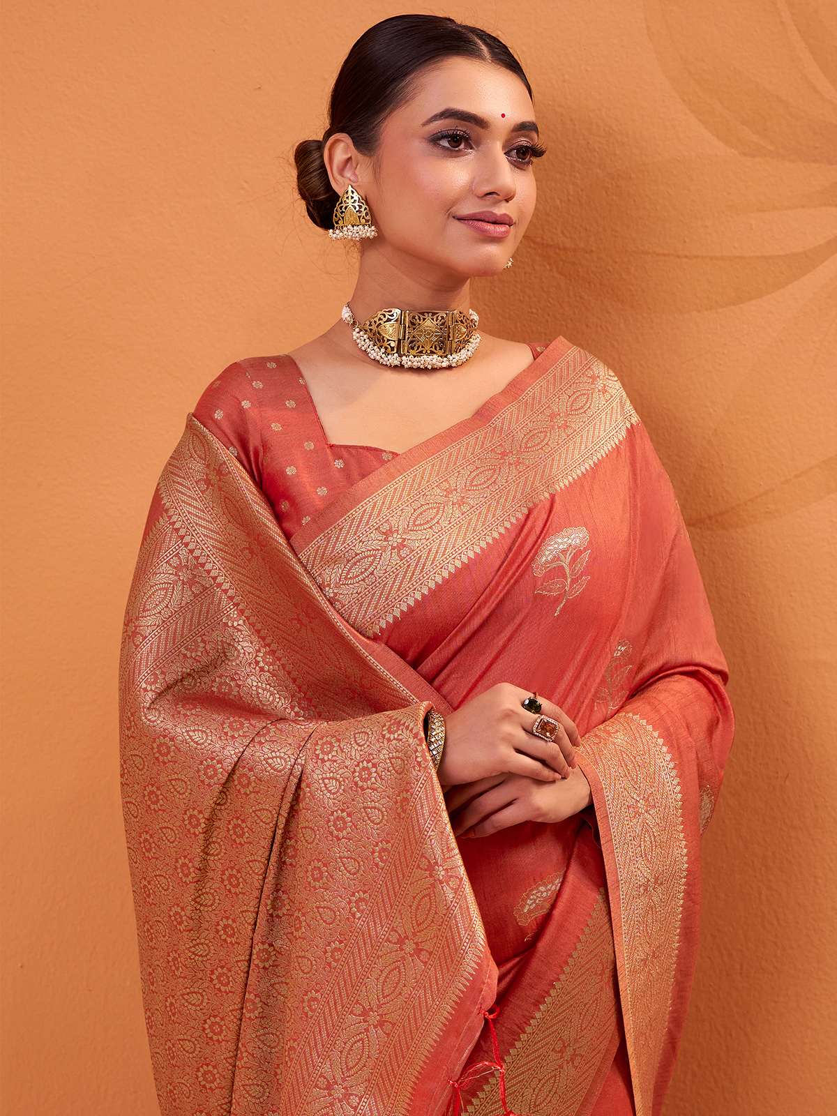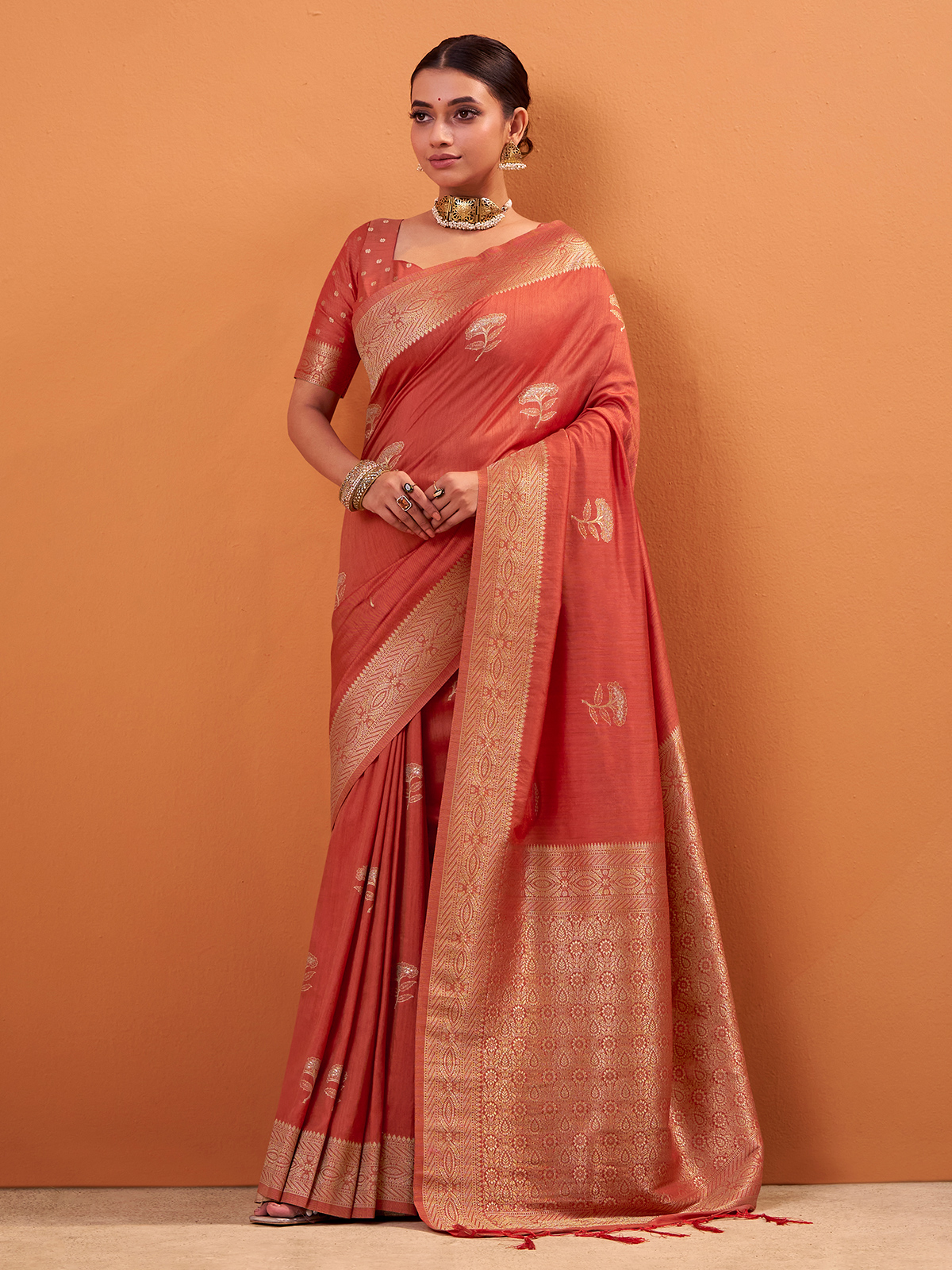 Peach Tusser Silk Saree Adorned With Zari Weaves